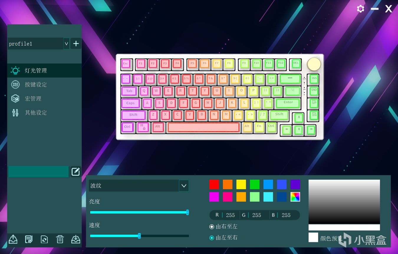 鍵盤一共有18種燈光方式(不得不說燈光取名挺有意思),可自定義亮度,速度,顏色,方向等參數,可玩性挺高的。