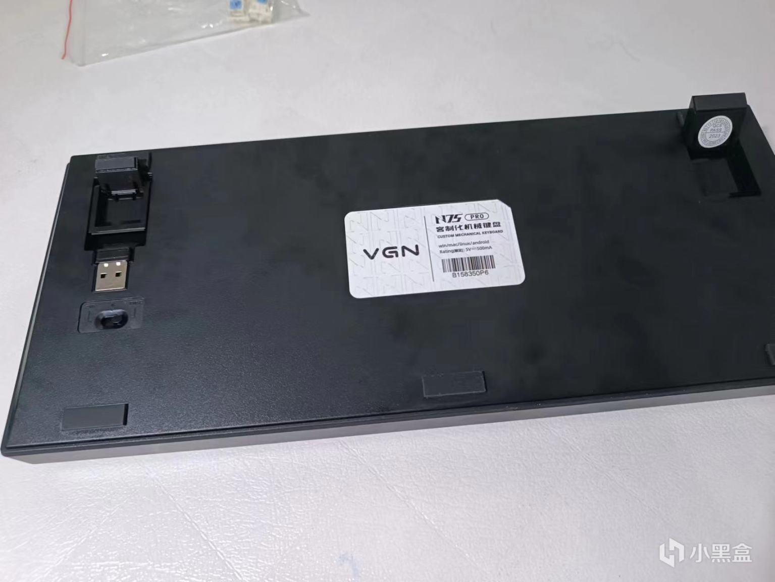 鍵盤背面比較簡潔,兩個兩級調節的墊子可以較爲靈活的切換高度。2.4G接收器被卡在凹槽裏,還是很牢固的。