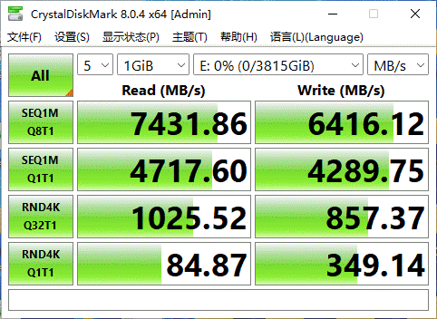 利用Crystaldiskmark进行跑分测试:读取速度高达7432MB/s,写入速度达到了6416MB/s。与官方给出的读写速度极为接近。
