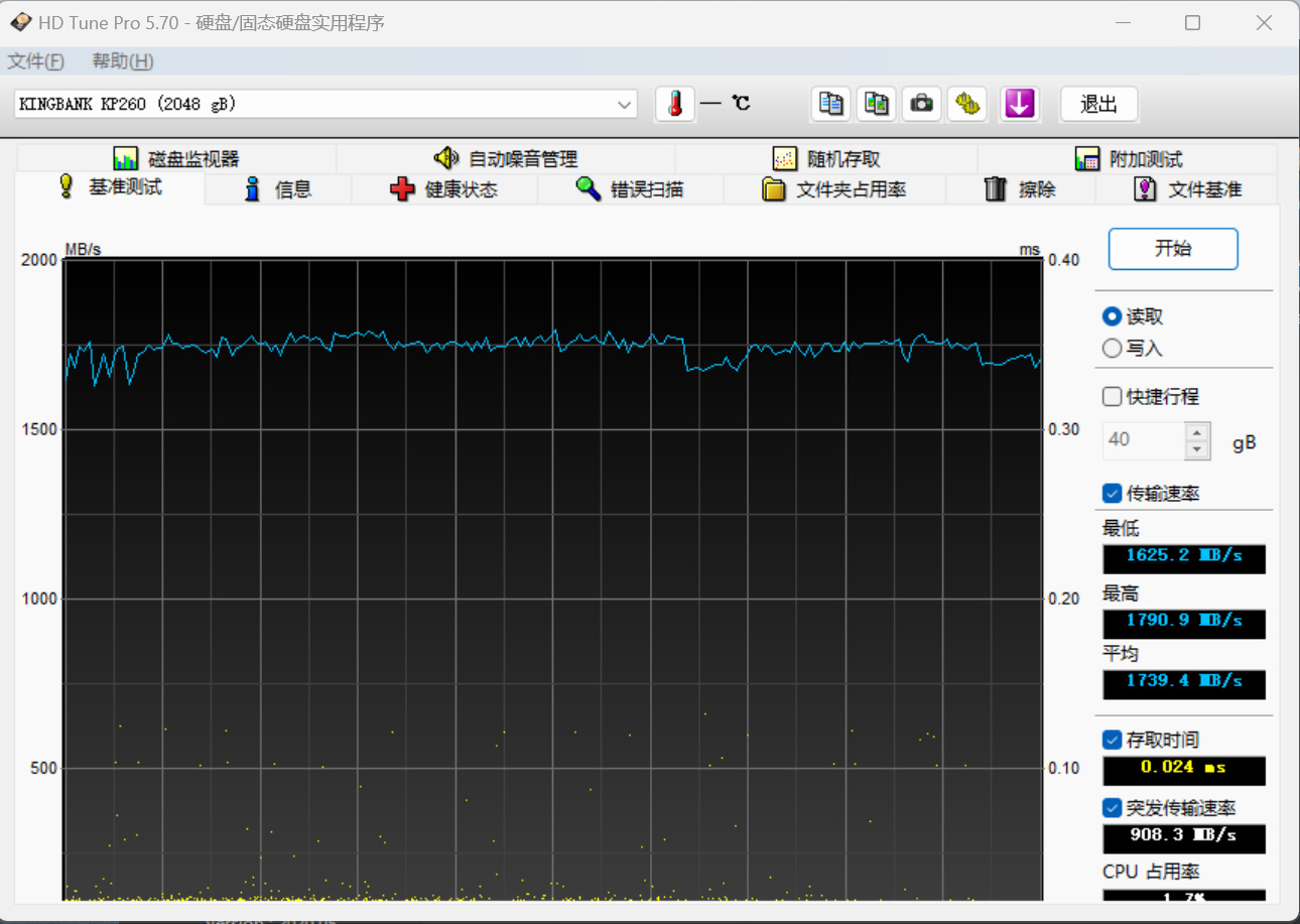 借助软件HD Tune对硬盘进行基准测试,从曲线表现来看读写都是相当稳定,存取时间也是非常短,整体表现还是非常出色。