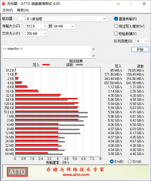 利用ATTO测试不同大小文件写入速度,16KB到32KB是一个提升明显的趋势,大于等于32KB的文件写入速度就已经非常快了,读取速度在256KB的文件大小可以发挥这款SSD的最佳状态,整体表现还是相当出色。