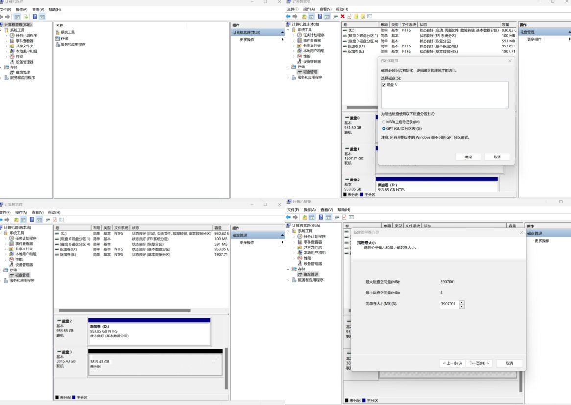 安装完成之后装好主机箱,接通电源开机成功识别,然后进行初始化设置,由于我装了四个固态硬盘都没有分区,自然而然这一个也直接整块使用不用分成几个盘使用。