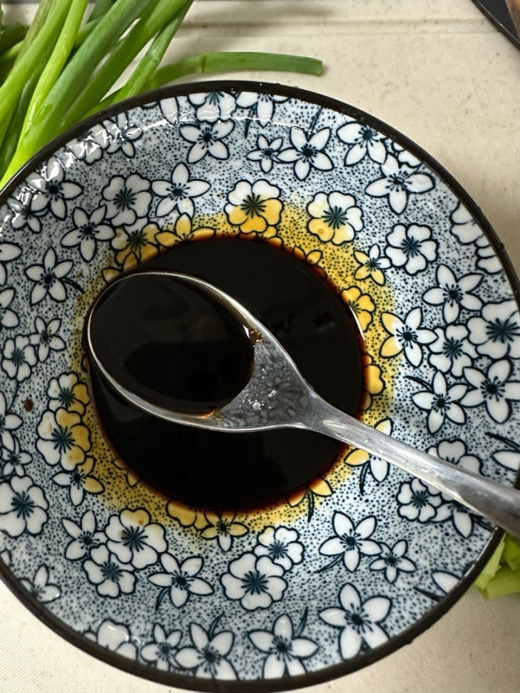2.在炸葱油的同时,准备小碗,碗中加入3勺生抽,一勺老抽,半勺白糖