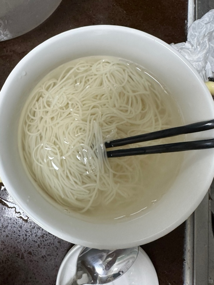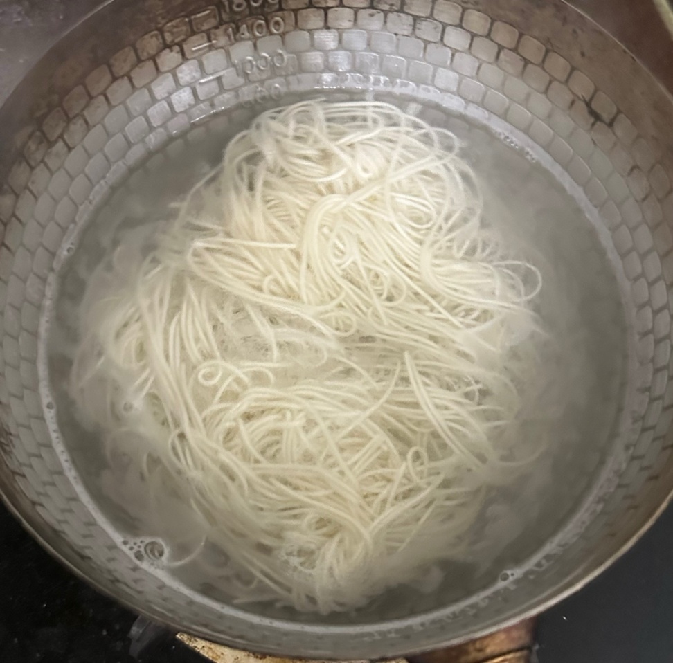 4.烧水下面,面熟加入凉水中涮一下捞出来淋上葱油就可以吃了