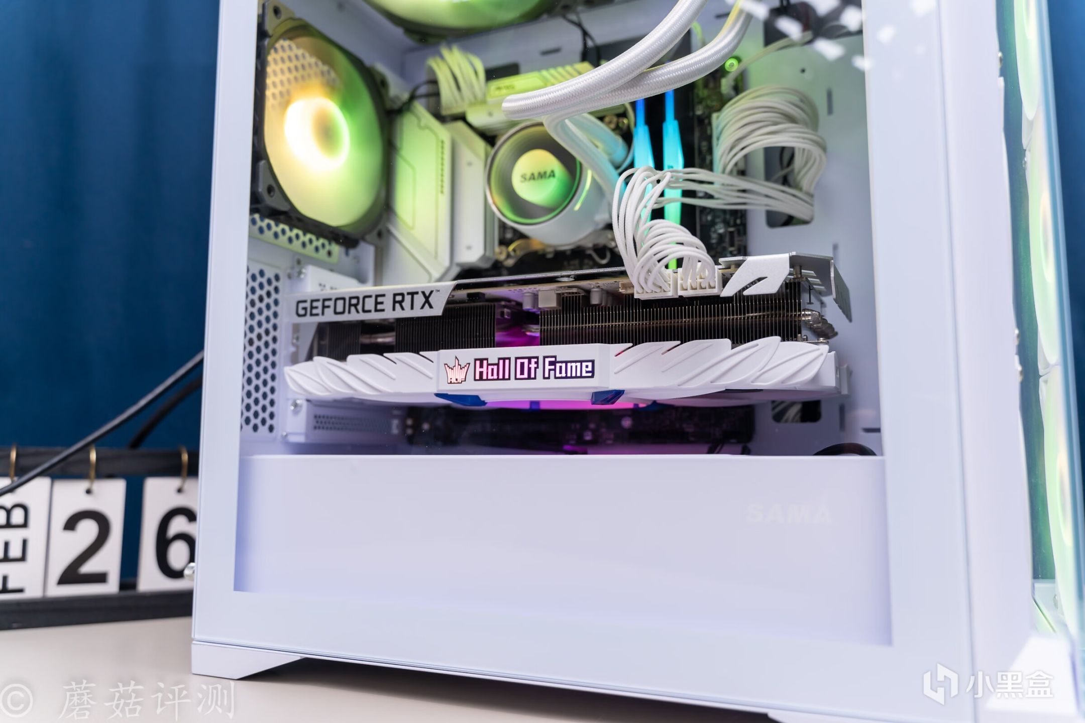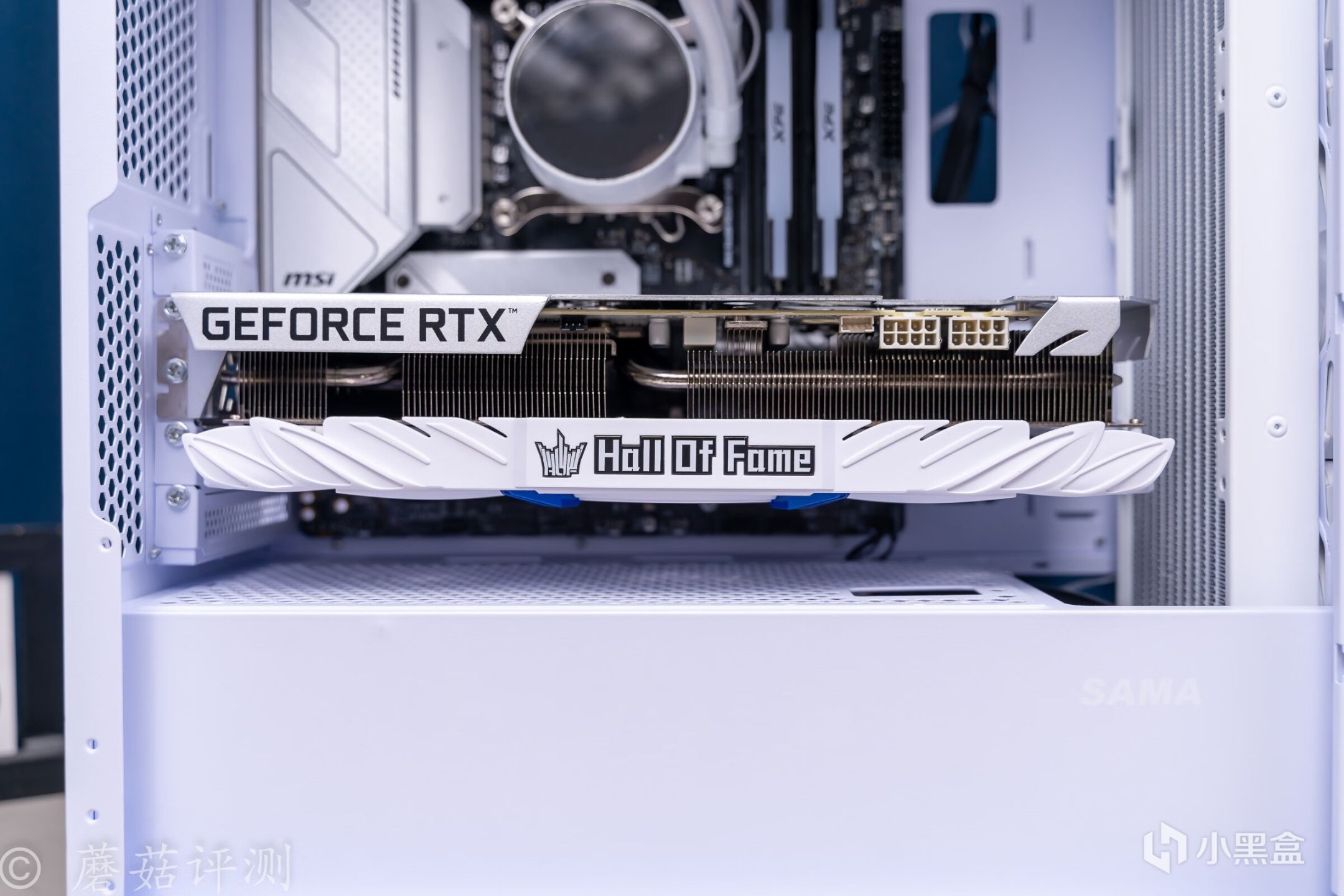 ▼显卡默认横置安装,显卡侧面的颜值也很漂亮,有HOF的字样,并且支持灯效。