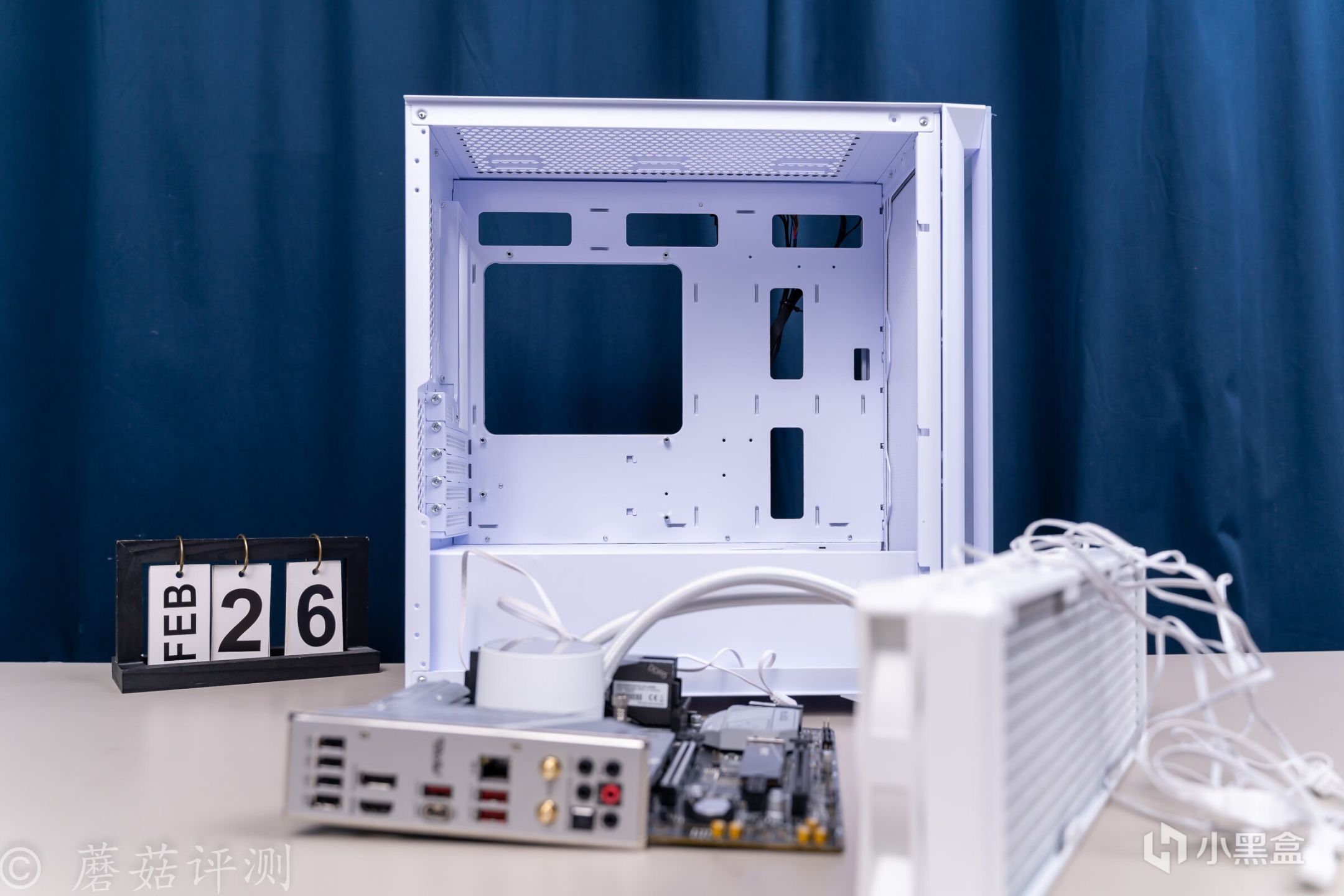 ▼主板固定在左侧,水冷排安装在机箱的前部,这款机箱的前部支持360水冷。
