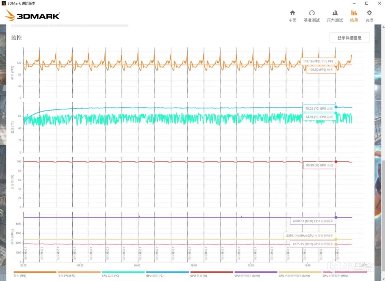 ▼3Dmark的压力测试,帧数稳定率在98.2%,非常稳定。