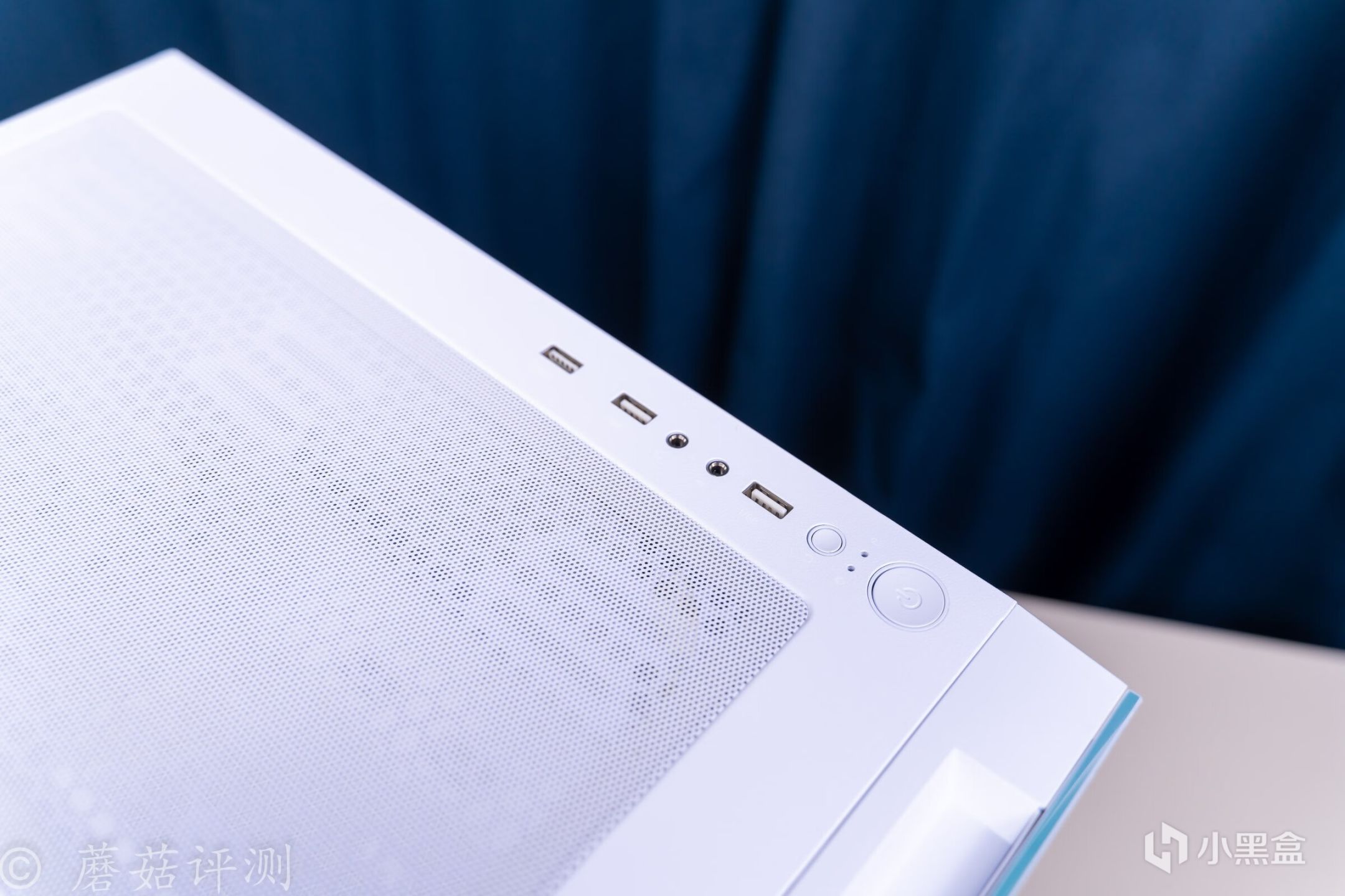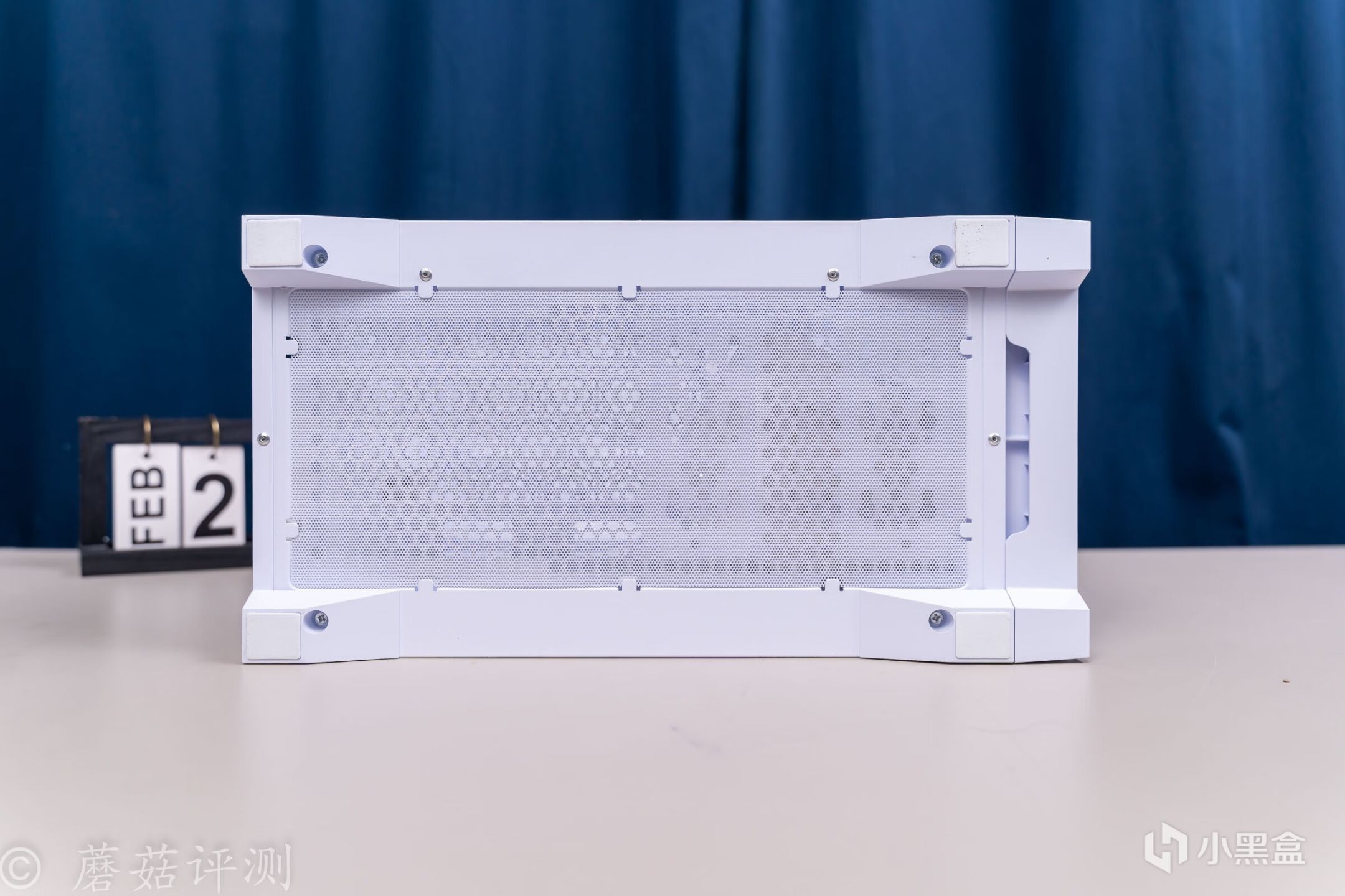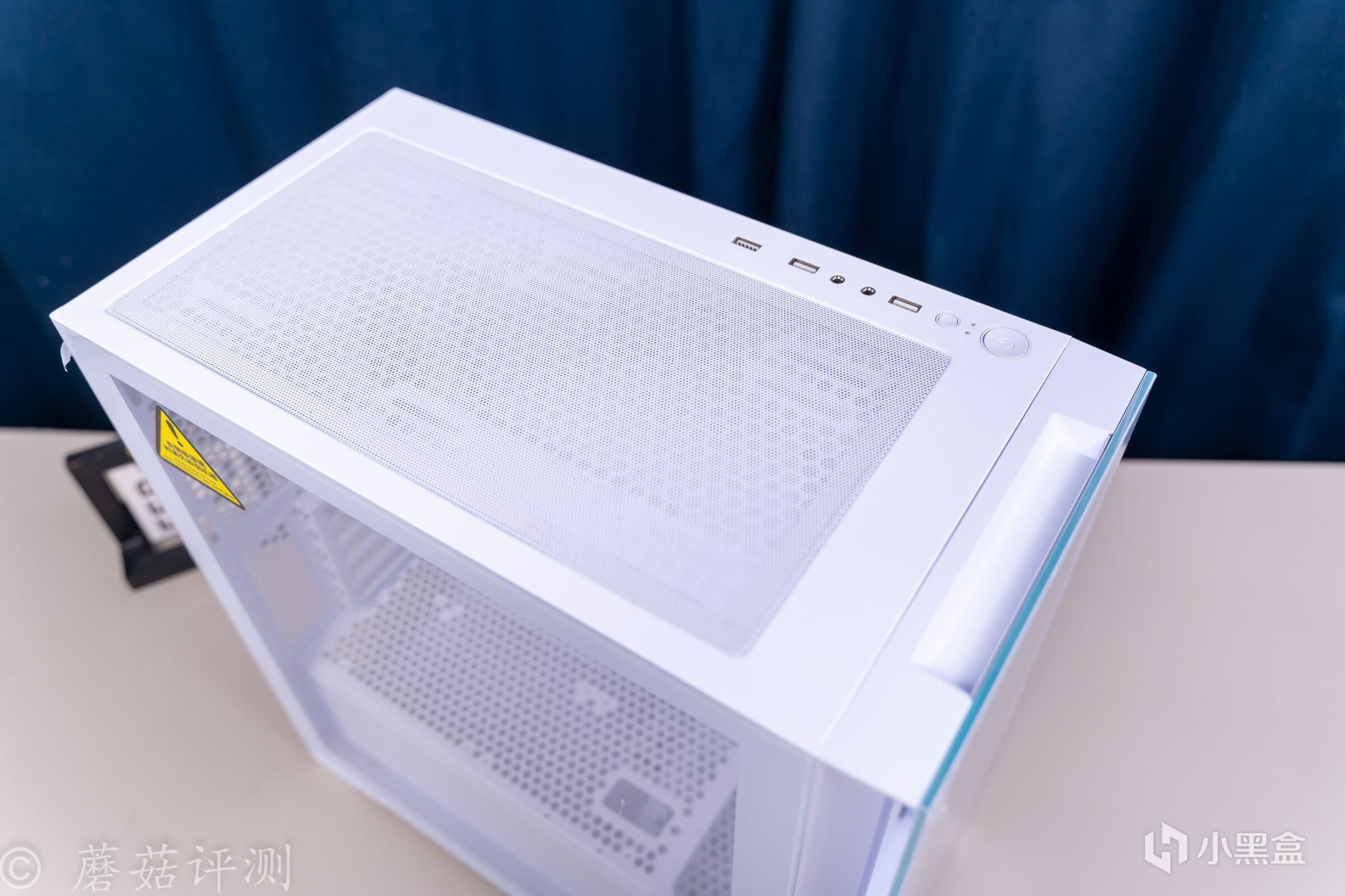 ▼机箱顶部有面积多大的出风口,纯白色的磁吸防尘网贴在上面。