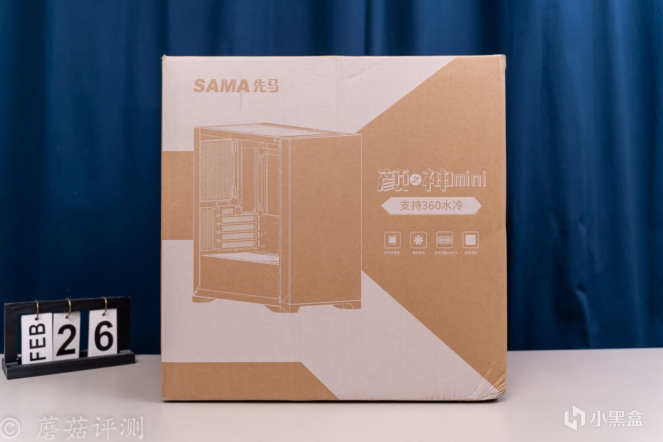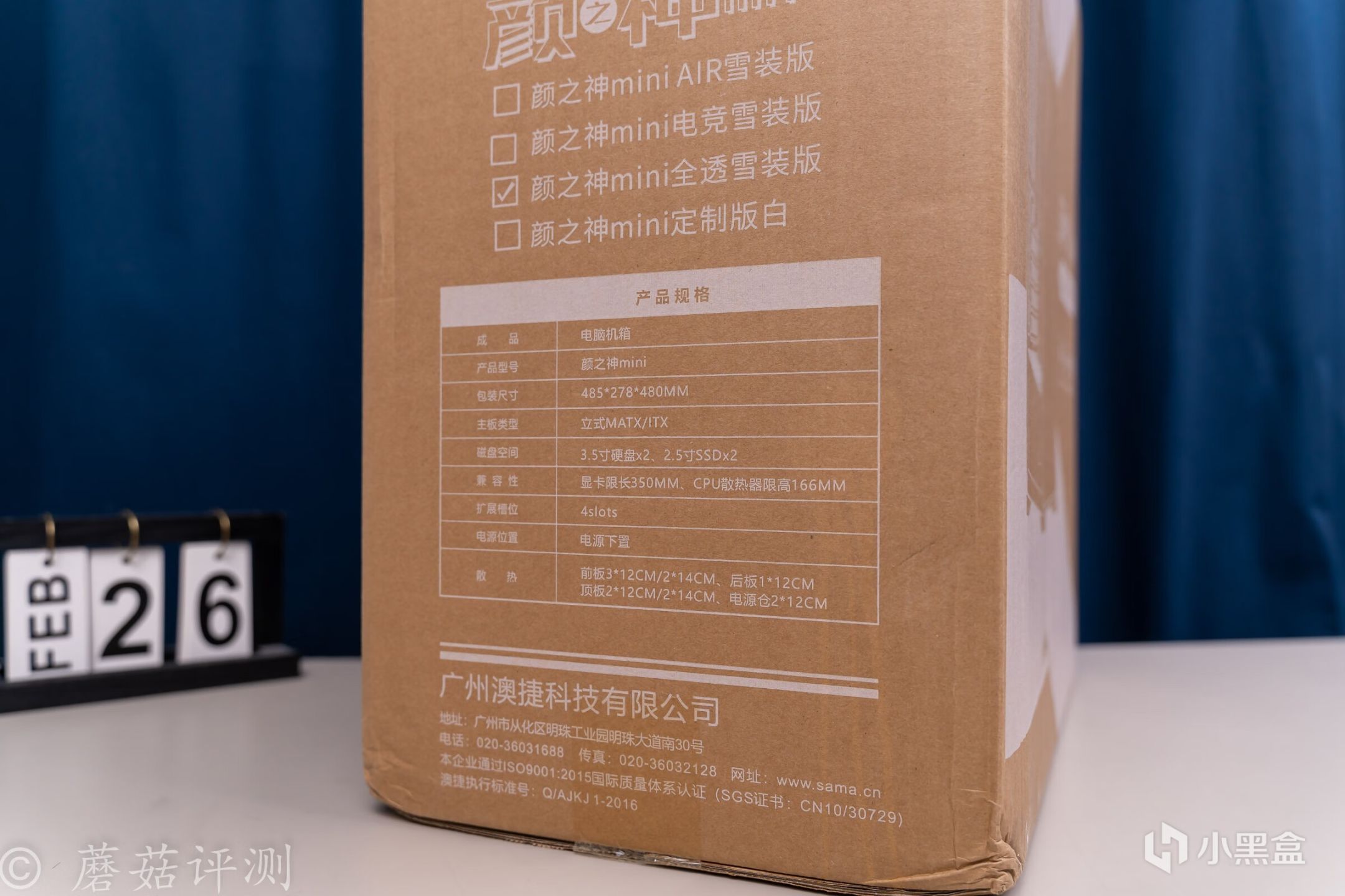 ▼机箱就是先马的颜之神Mini全透雪装版,机箱的正面有机箱的型号,左侧是机箱的外观。
