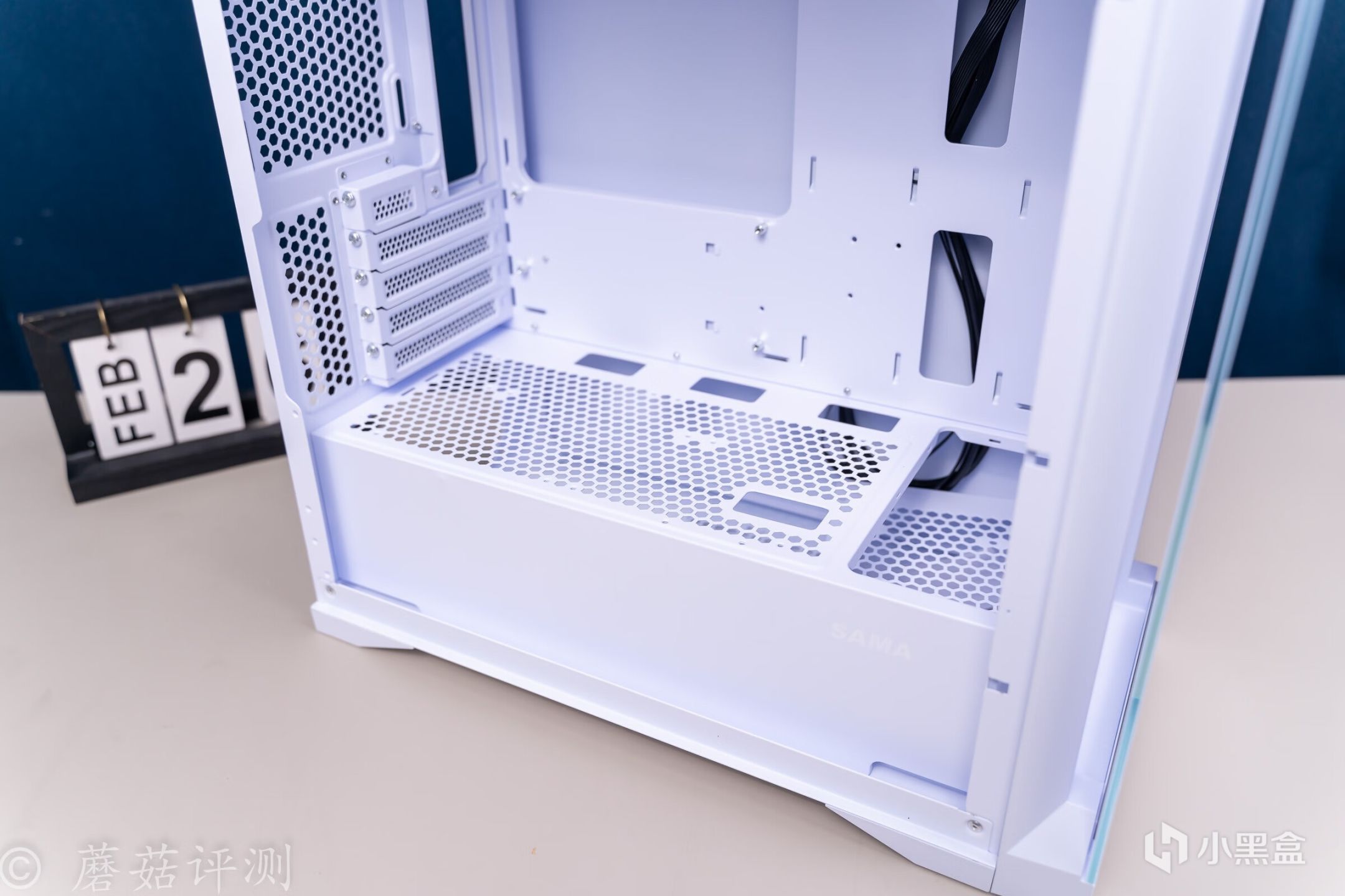 ▼机箱底部是独立的电源仓,电源仓的上部有丰富的格栅以及开孔,方便走线和安装各种硬件。