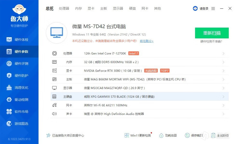 ▼整机配置一览,处理器是12700K,显卡是影驰的RTX3080,主板是微星的B660M迫击炮WIFI DDR5,整体的配置还是非常不错的。