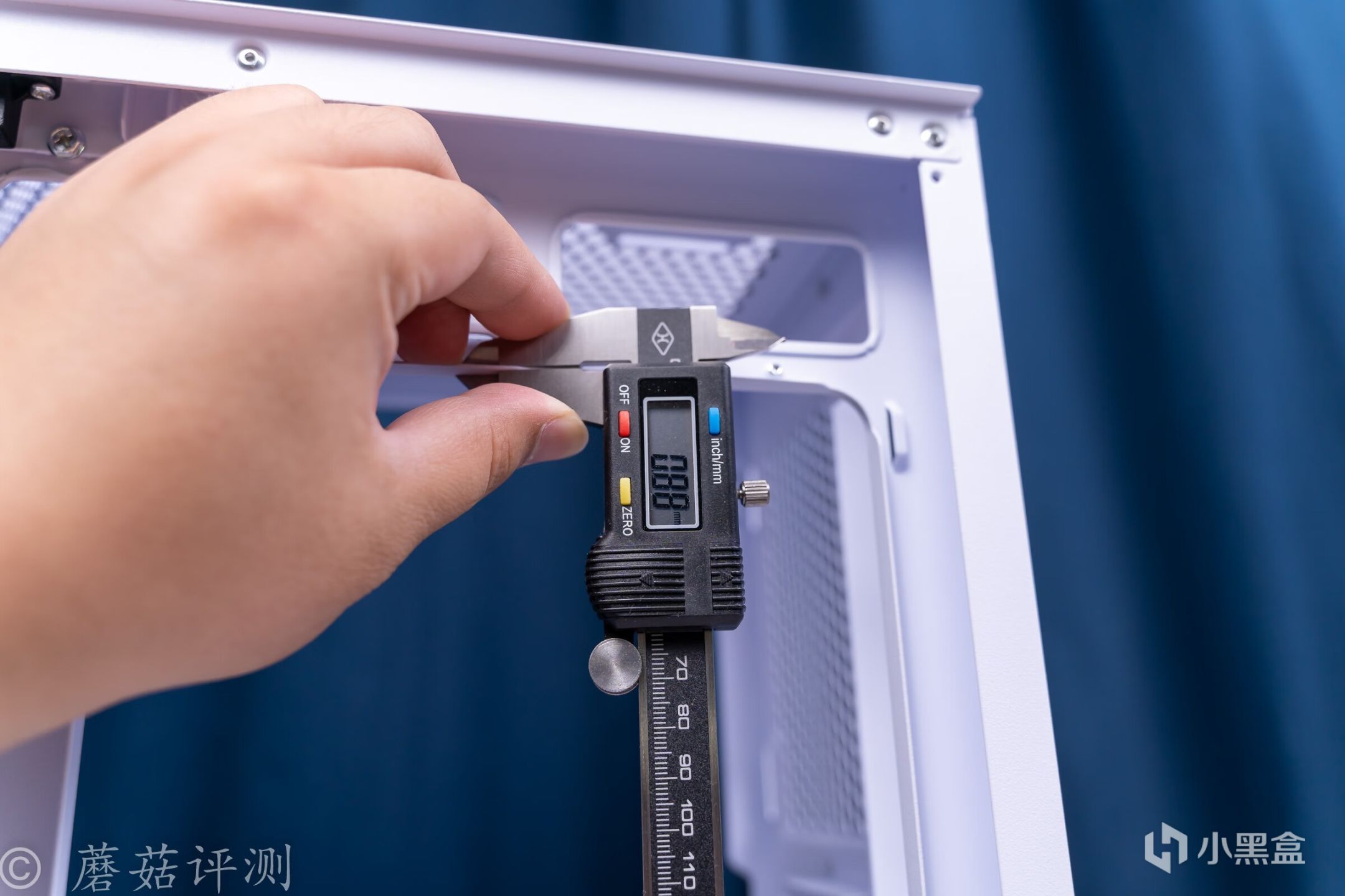 细节方面,这款机箱的用料非常棒,实测五金厚度在0.88mm,机箱整体非常硬朗。另外,主板四周的走线接口非常多,机箱背面的背线空间非常充足,金属扣的数量也很多,理线会非常方便。