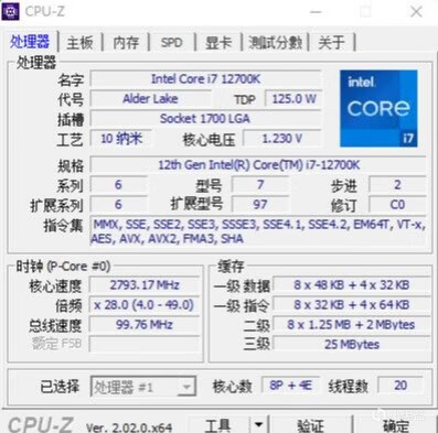 ▼处理器是12700K,8个大核、4个小核,三级缓存25MB,整体性能表现不错。
