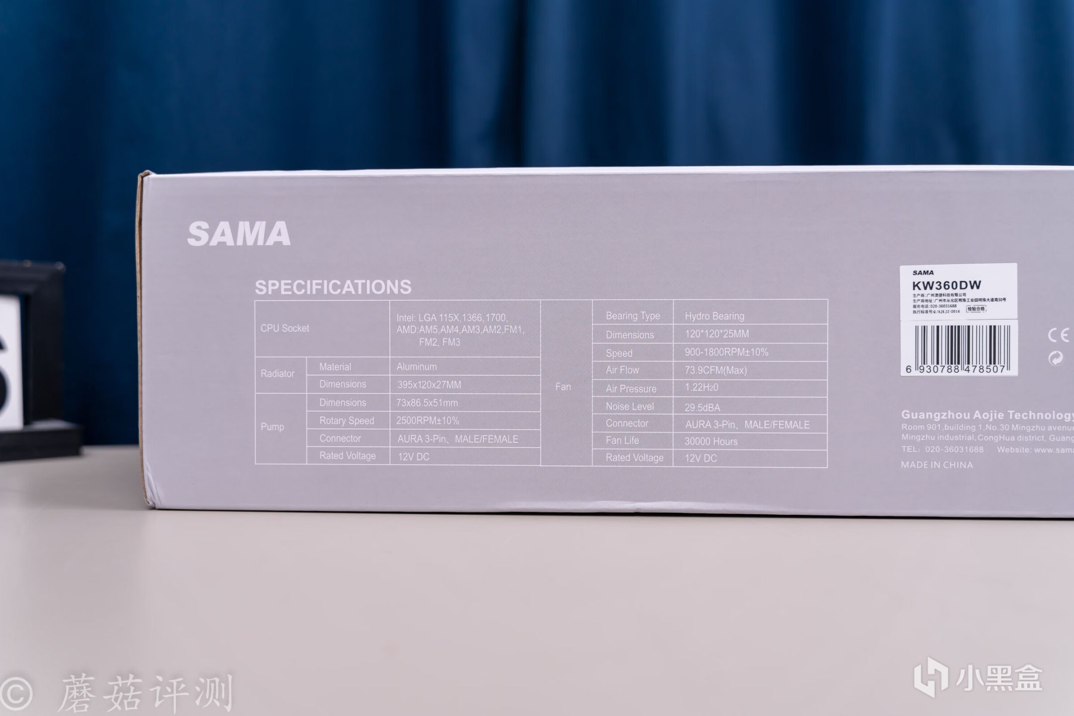 ▼水冷包装的侧面有详细的参数,包括风扇的风压、风量等。