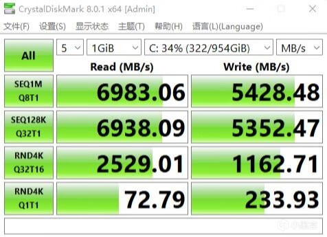 ▼简单跑个测试,顺序读取在7000MB/s、写入5420MB/s,4K读取72MB/s、写入233MB/s,性能表现不错。