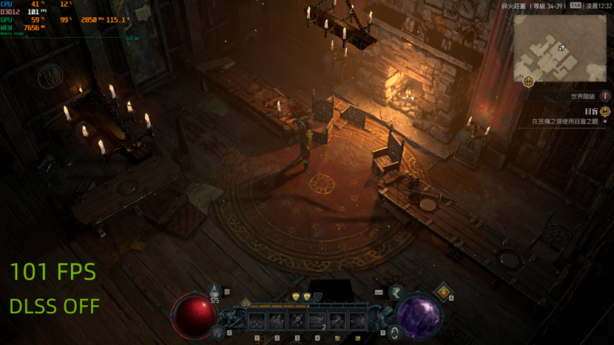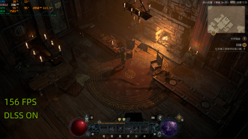 DLSS 3开启时,游戏图像比不开启时更锐利一些,烛火发出的光照射在地面上细节表现更好一点,光影细节表现出色,游戏FPS实现接近50%的提升。