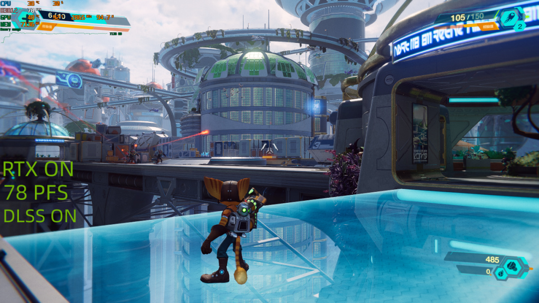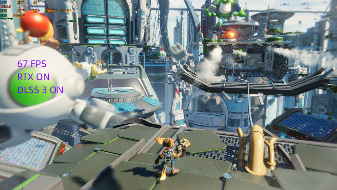 《瑞奇与叮当:时空跳转》,开启DLSS 3 设为平衡,游戏平均帧从22帧提升到流畅运行的68帧。