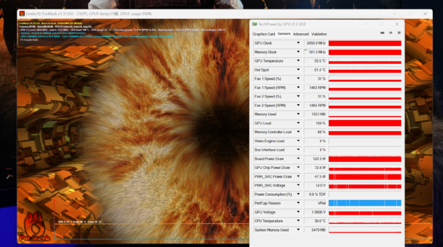 显卡最高55.5度左右,风扇转速1463RPM左右,噪音很低,显卡非常安静