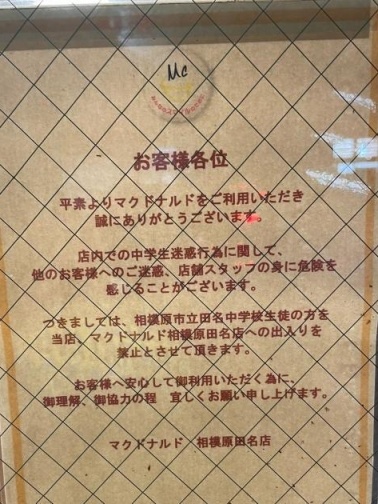 日本神奈川縣相模原市內的一家麥當勞餐廳將附近一所中學的所有學生拉入了“禁止入內”的黑名單,不消費還喜歡鬧事!