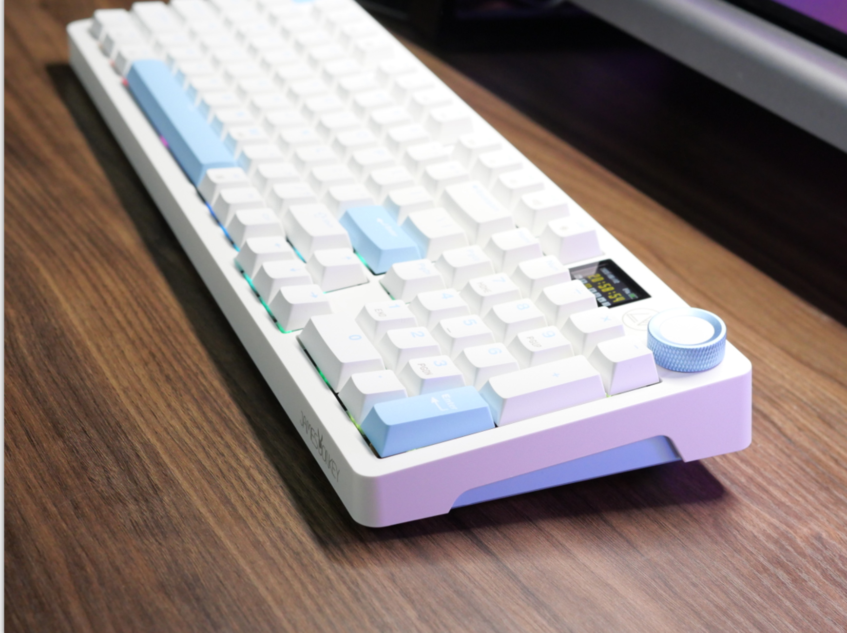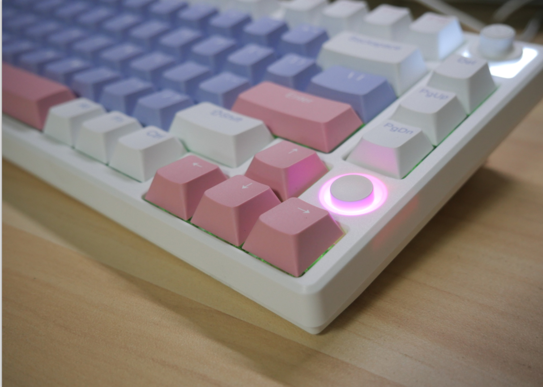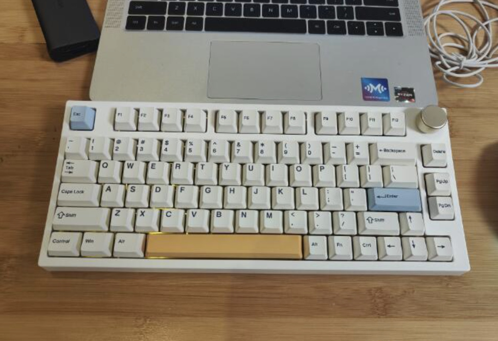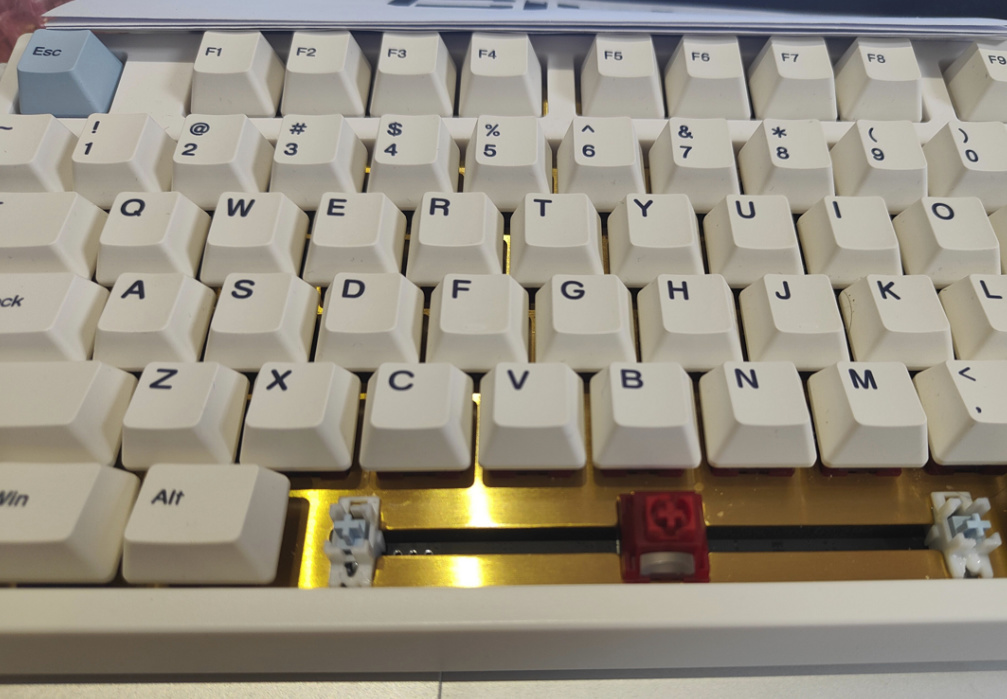 而我这把是昙花白轴,类银轴,而且回弹非常顶,有点TTC烈焰红那个感觉,但是还更Q一点,也是一款并没有火起来的好轴。不过现在这个轴大概没什么火的机会了,它从声音到手感已经不是现在主流追求方向了。现在主流的轴体一定要有POM,得是那种不管上没上油,都有一点油汪汪感觉的手感。