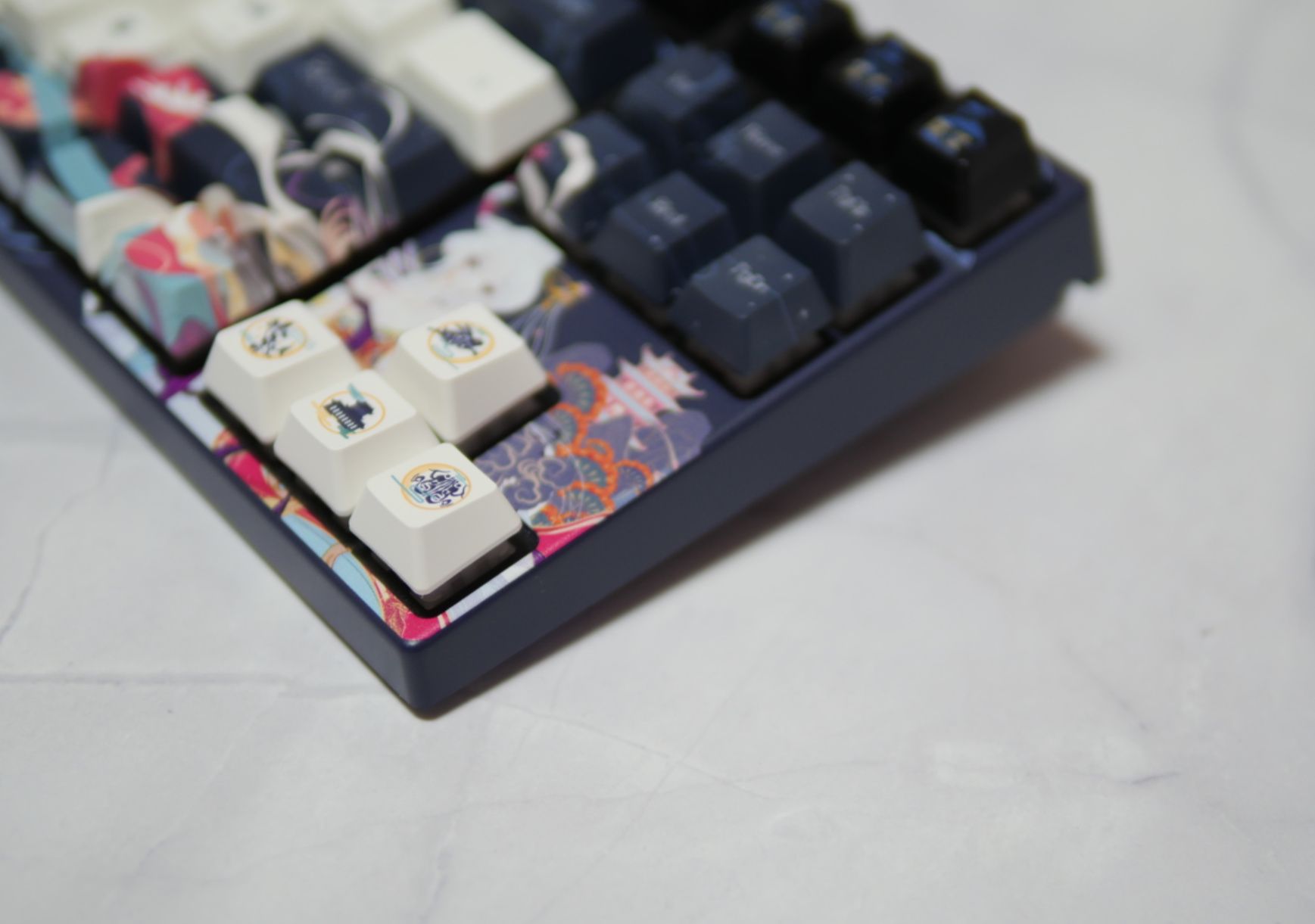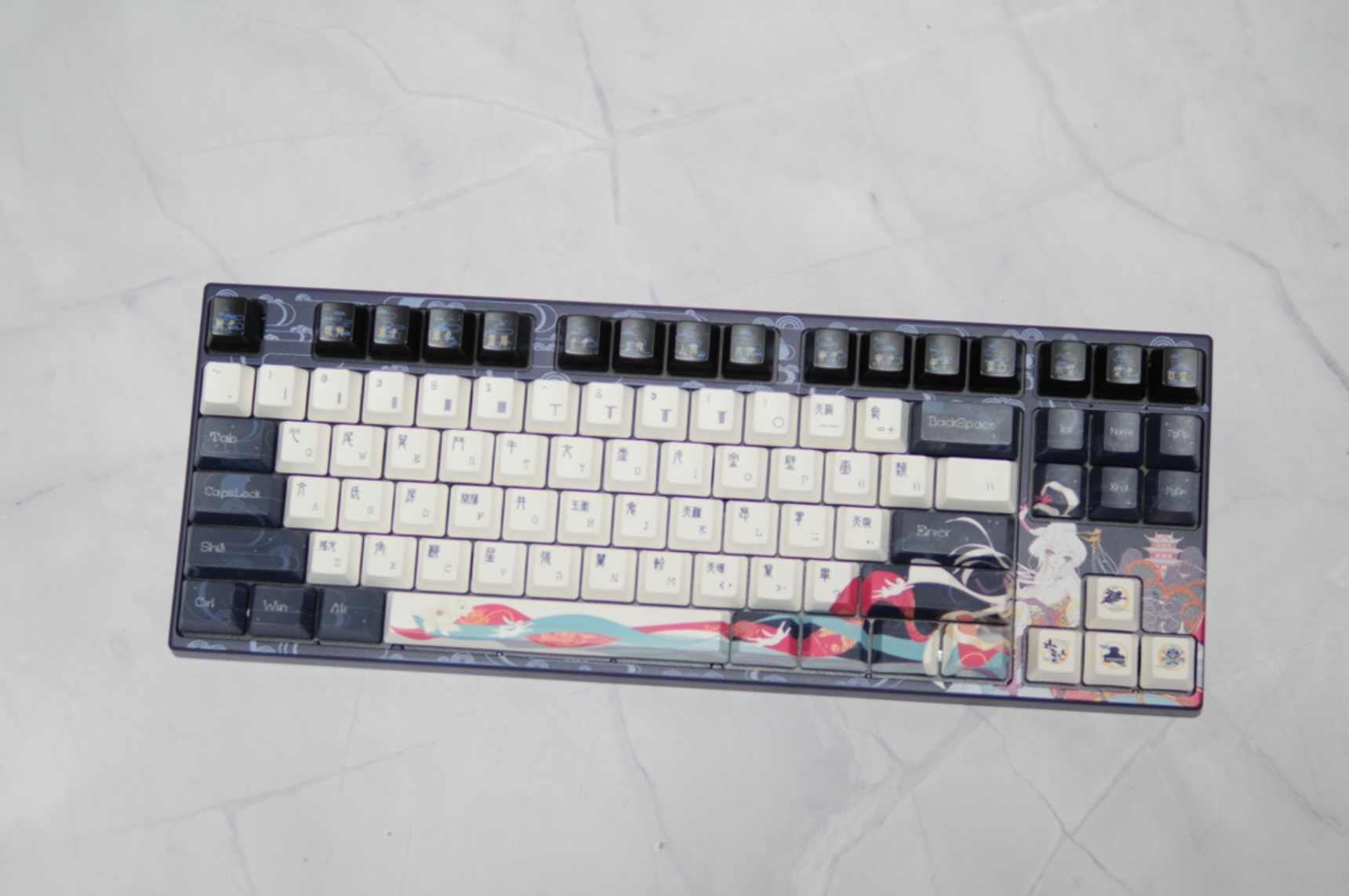 接下来说一下阿米洛的两款键盘,嫦娥算是阿米洛中国娘系列,也是国风系列的巅峰之作,除了正反UV印刷的图案以及顶级的热升华键帽之外,F区的月相设计也是让人眼前一亮。