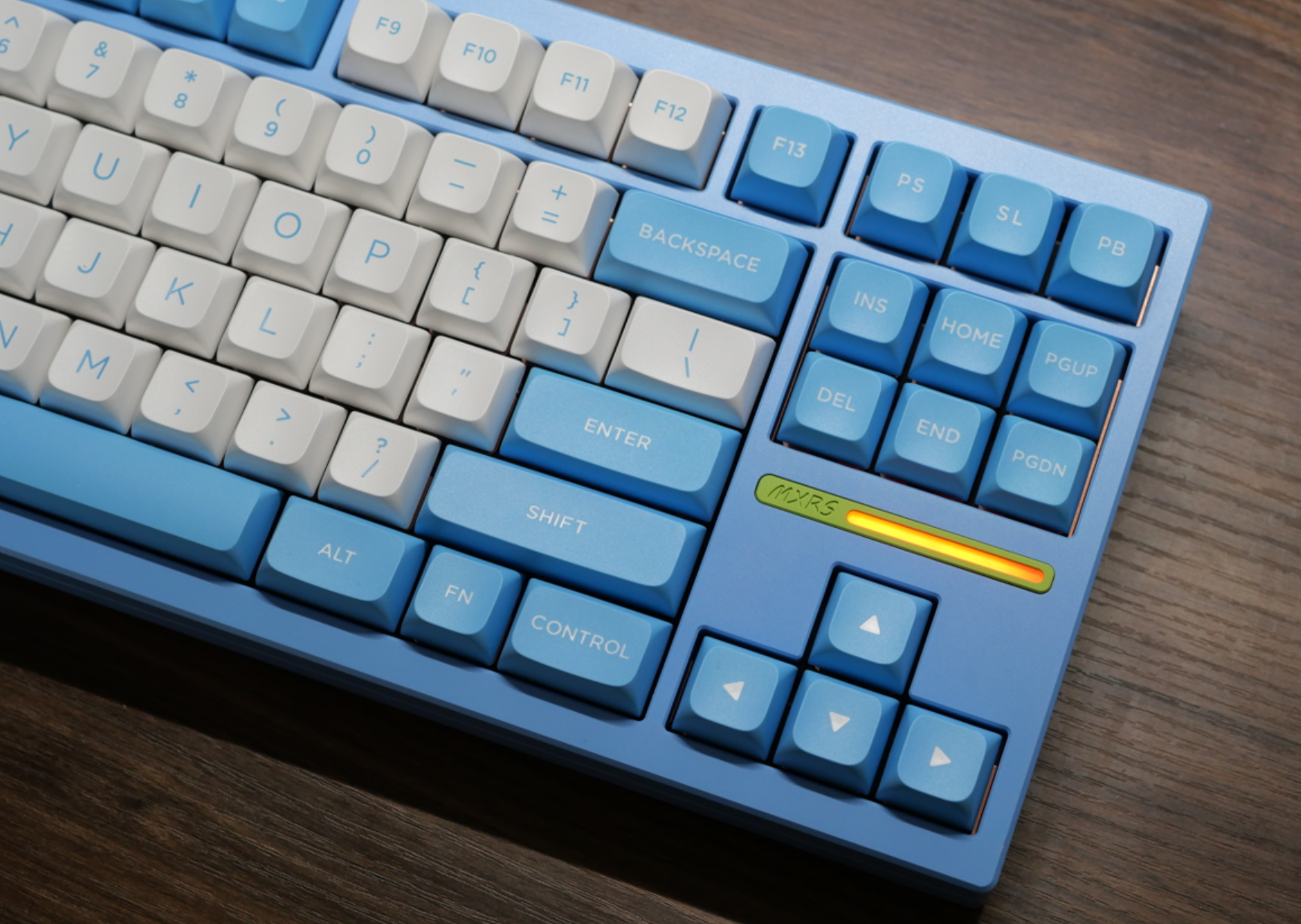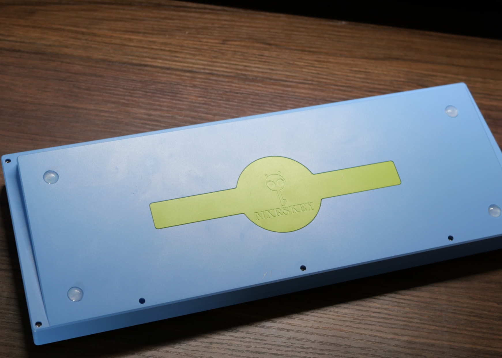 外壳可选阳极工艺和电泳工艺两种,我手里的是电泳蓝色,整个外观的观感、手感完全不是几百元的阳极可比,暖色且非常细腻,当然了,容易出划痕,使用的时候要小心一点。才用了2mm厚度的超薄开槽PCB和极致单键开槽的沉金玻纤定位板。这个内胆配置的特点就是但凡上个差不多的线性轴,就能按出麻将音,手感也十分软弹。