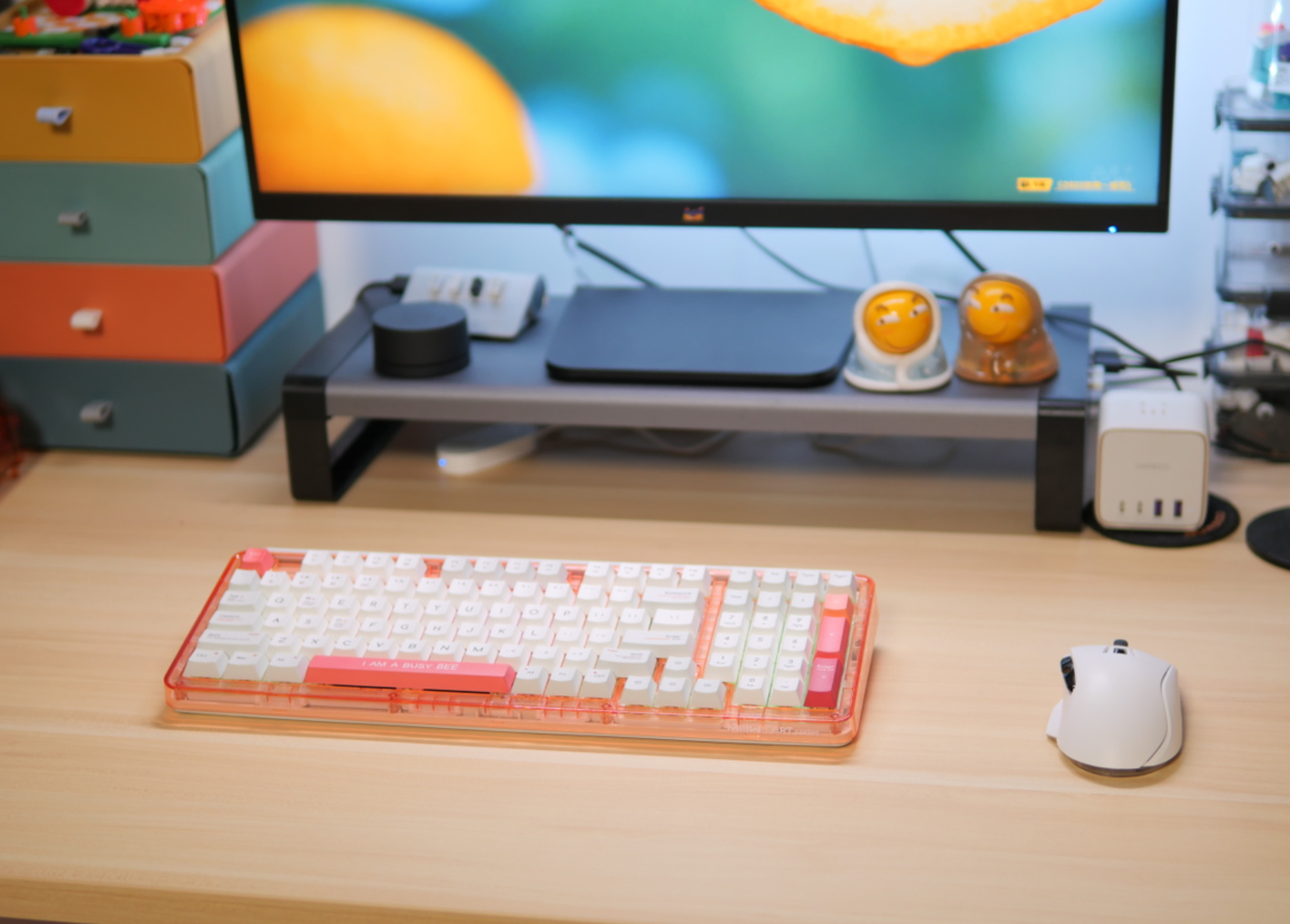 我唯一喜欢的一款矮轴机械键盘,使用凯华BOX矮白轴。之前用过不少矮轴键盘,手感上和常规轴体的差距真的是非常大,甚至可以说是毫无手感可言的,但是凯华的矮白轴属于段落轴体,可以感受到明显的段落感,相对于常规轴体,因为键程更短,所以整个段落是非常集中的,手感非常清脆。