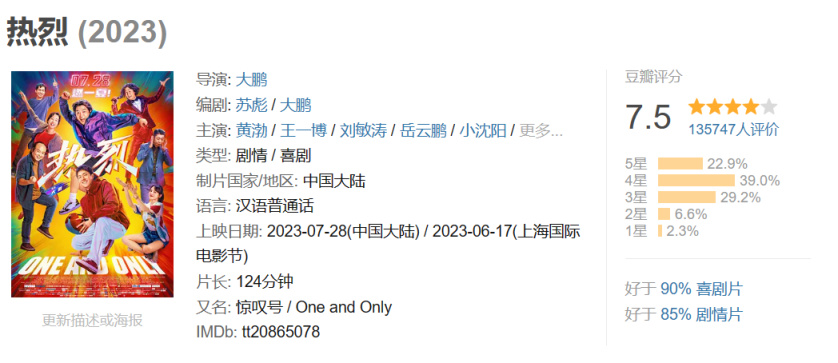 目前,电影《热烈》在国内知名评分网站豆瓣上的评分为7.5分,大多数参评用户为本片打出了4星推荐的评价