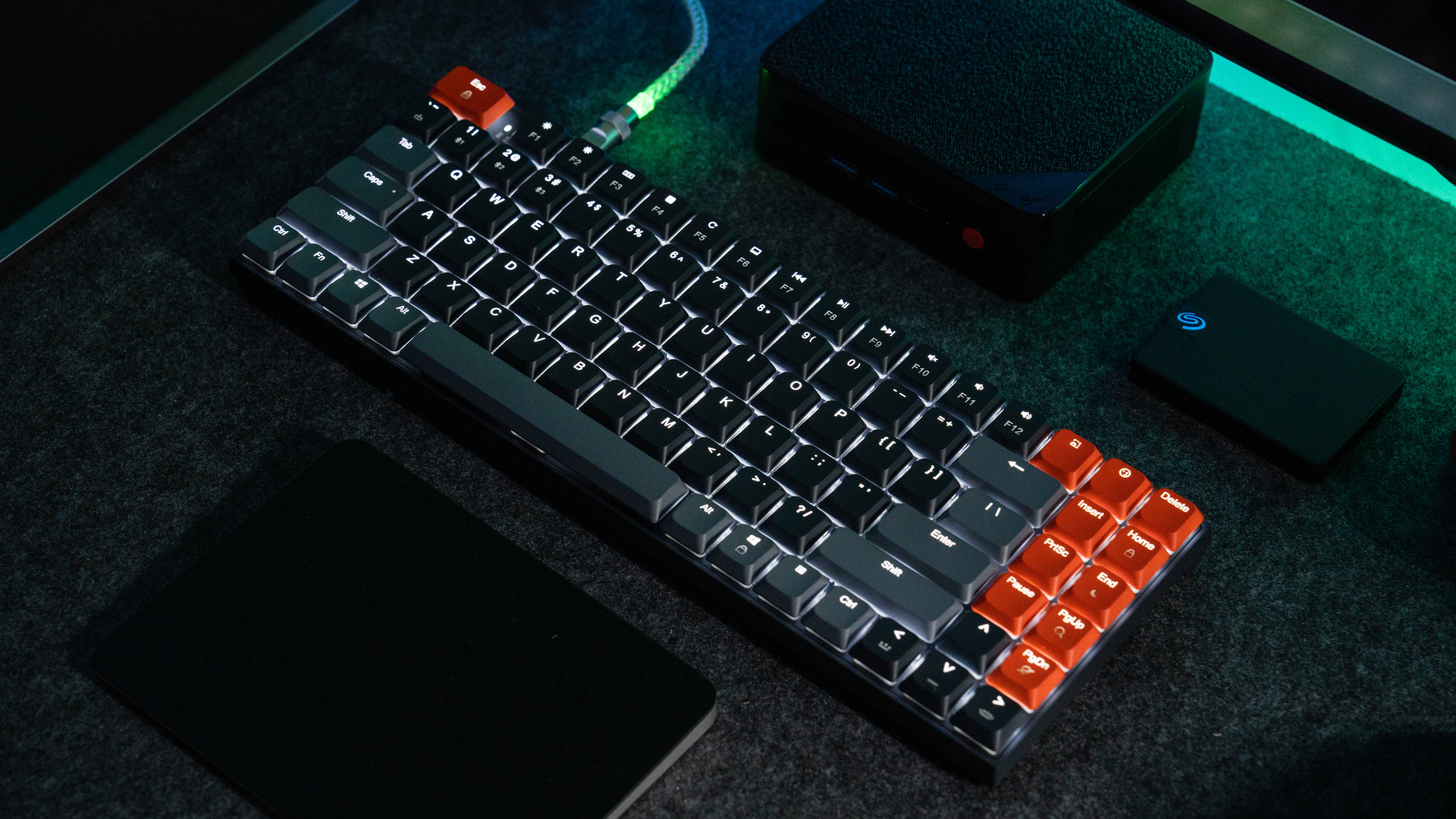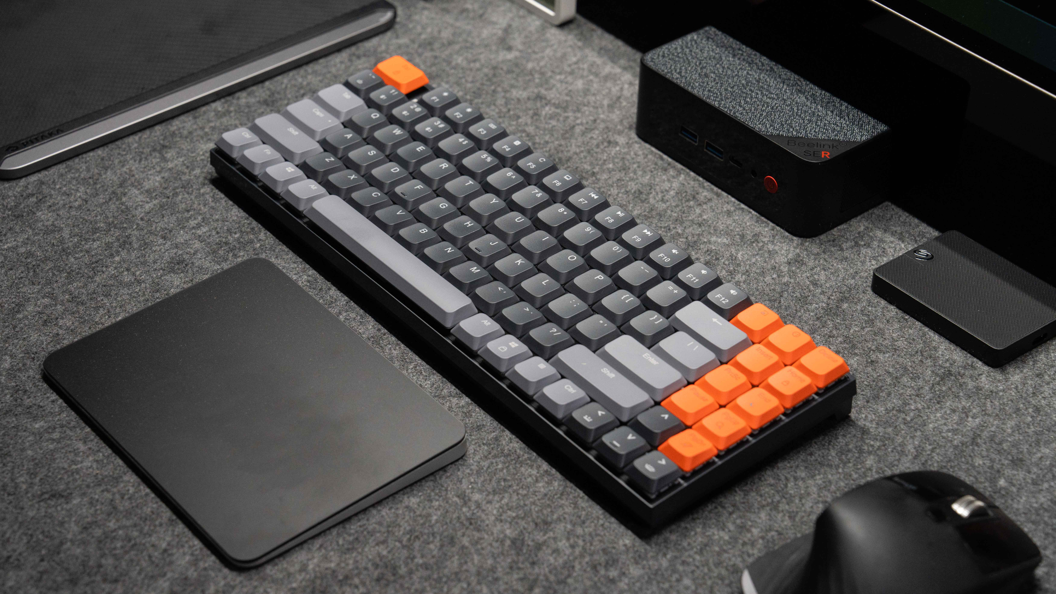 首先,这款键盘相当轻量化,键盘配备的机械矮轴,矮轴比较小众,但也有它独特的优势,得益于矮轴的轻量化,这款键盘只有485g,轻到你可以把他当笔记本的配件随身带就好。