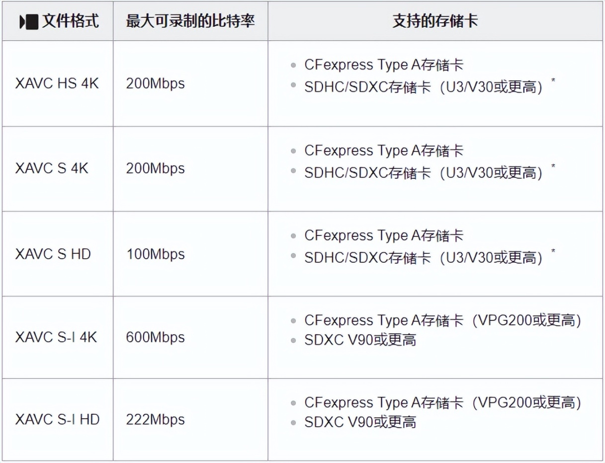 索尼官网关于A7M4适配的SD卡有如下介绍,视频来说,只有拍摄S-I 4K和HD才需要V90的卡,而低一些规格的画质对于我们日常拍摄基本没多大区别,而且视频文件巨大,传输、做片都是麻烦事。