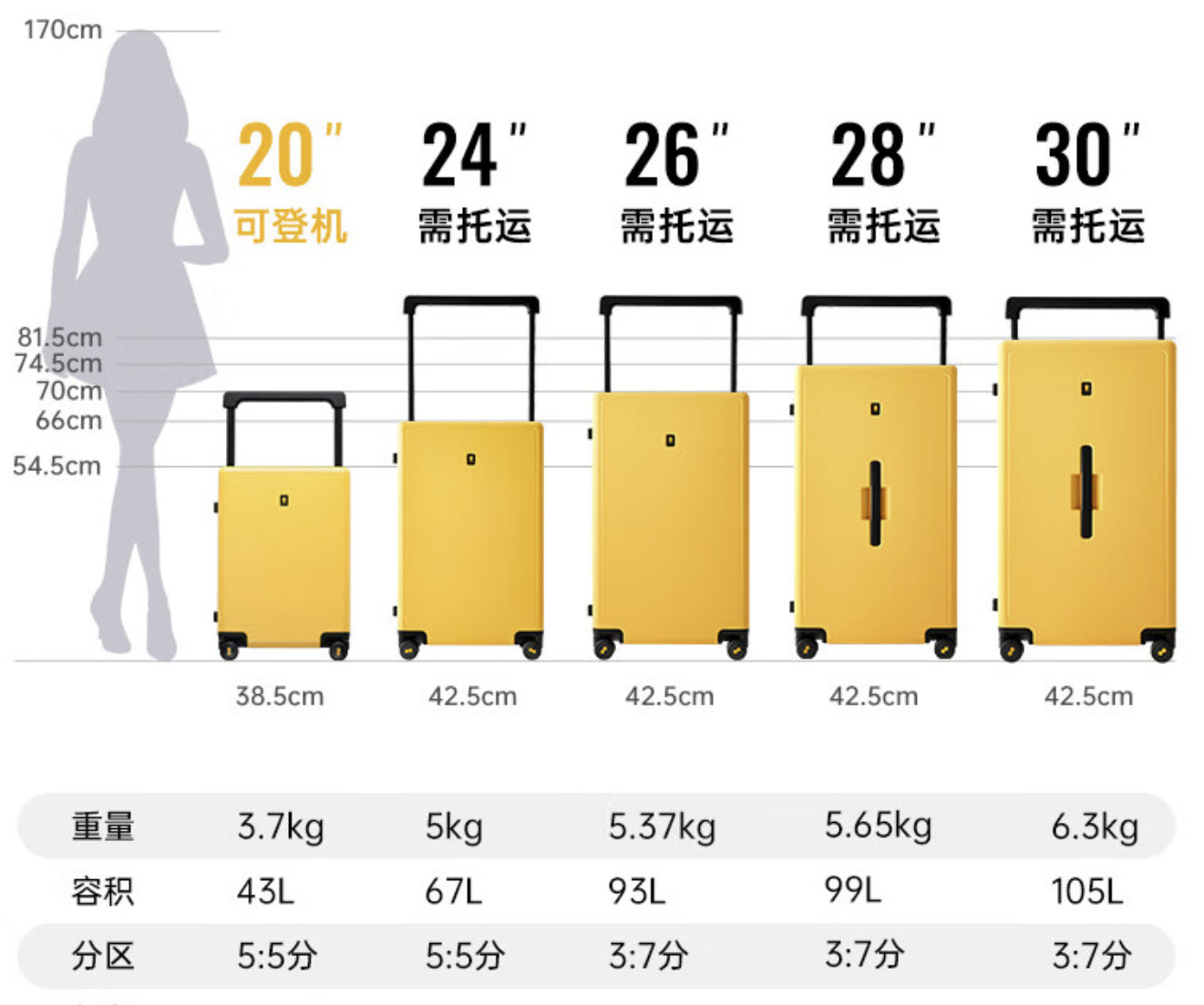 另外,24寸和20寸不只是长宽不同,厚度也不同,24寸容积是67L,而20寸容积是43L。