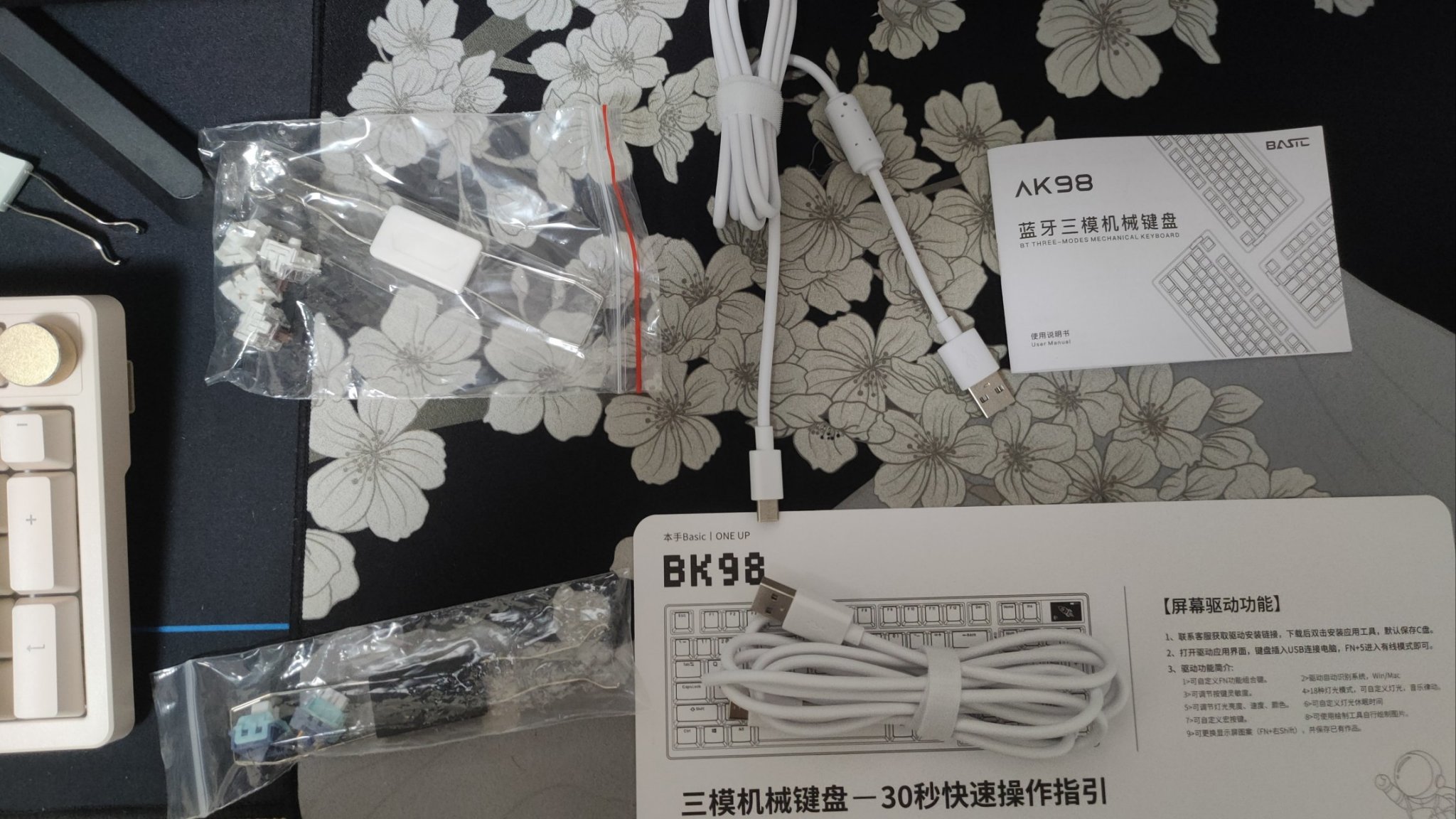 键盘本体,四颗茶轴,拔键器,一条数据线,还有一本厚厚的说明书。