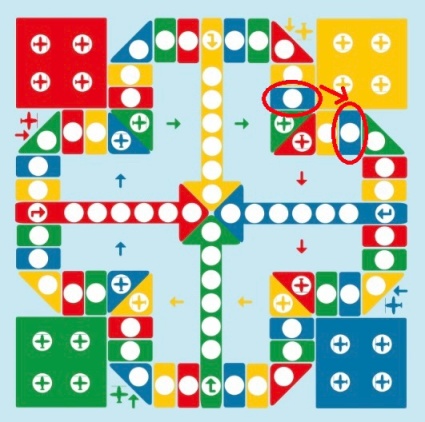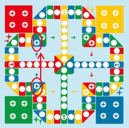 在停留到與自己棋子顏色相同的格子時,可以向前跳躍到下一個同色格子(以藍色爲例)