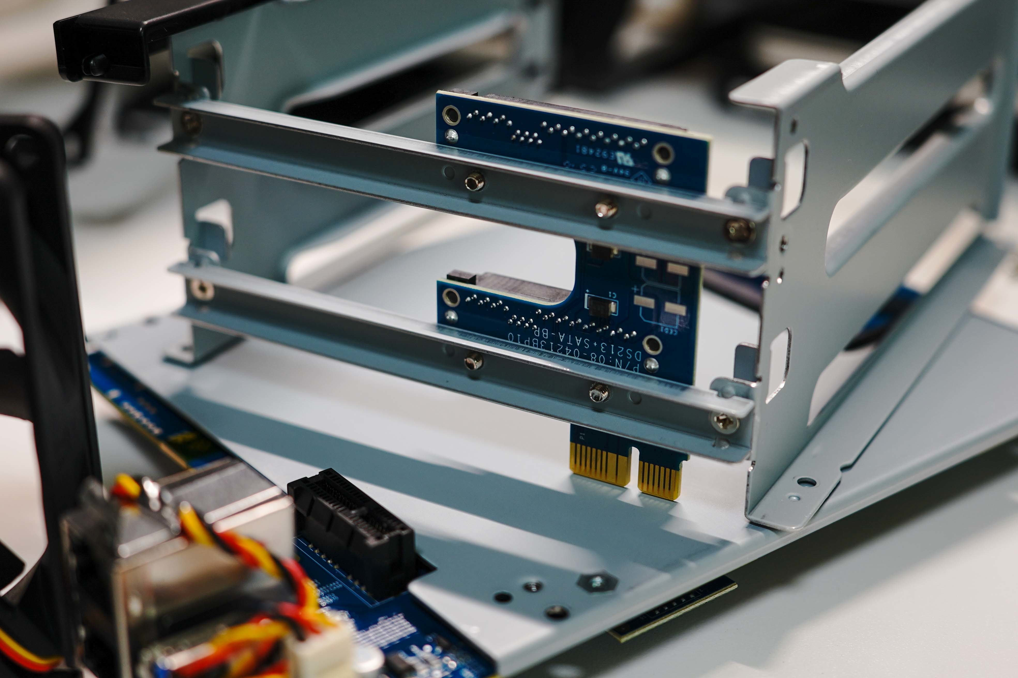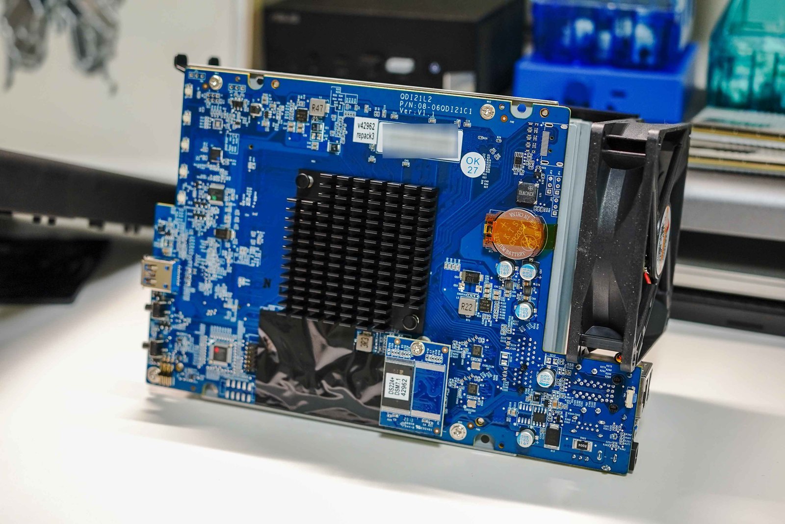 硬盘框架上的PCI转SATA拓展卡就有点寒碜了,整体光秃秃的,不过考虑到这只是个双盘位NAS,供电和稳定性倒是不用担心,毕竟我自己的DS220+跑了几年了也没啥事儿。