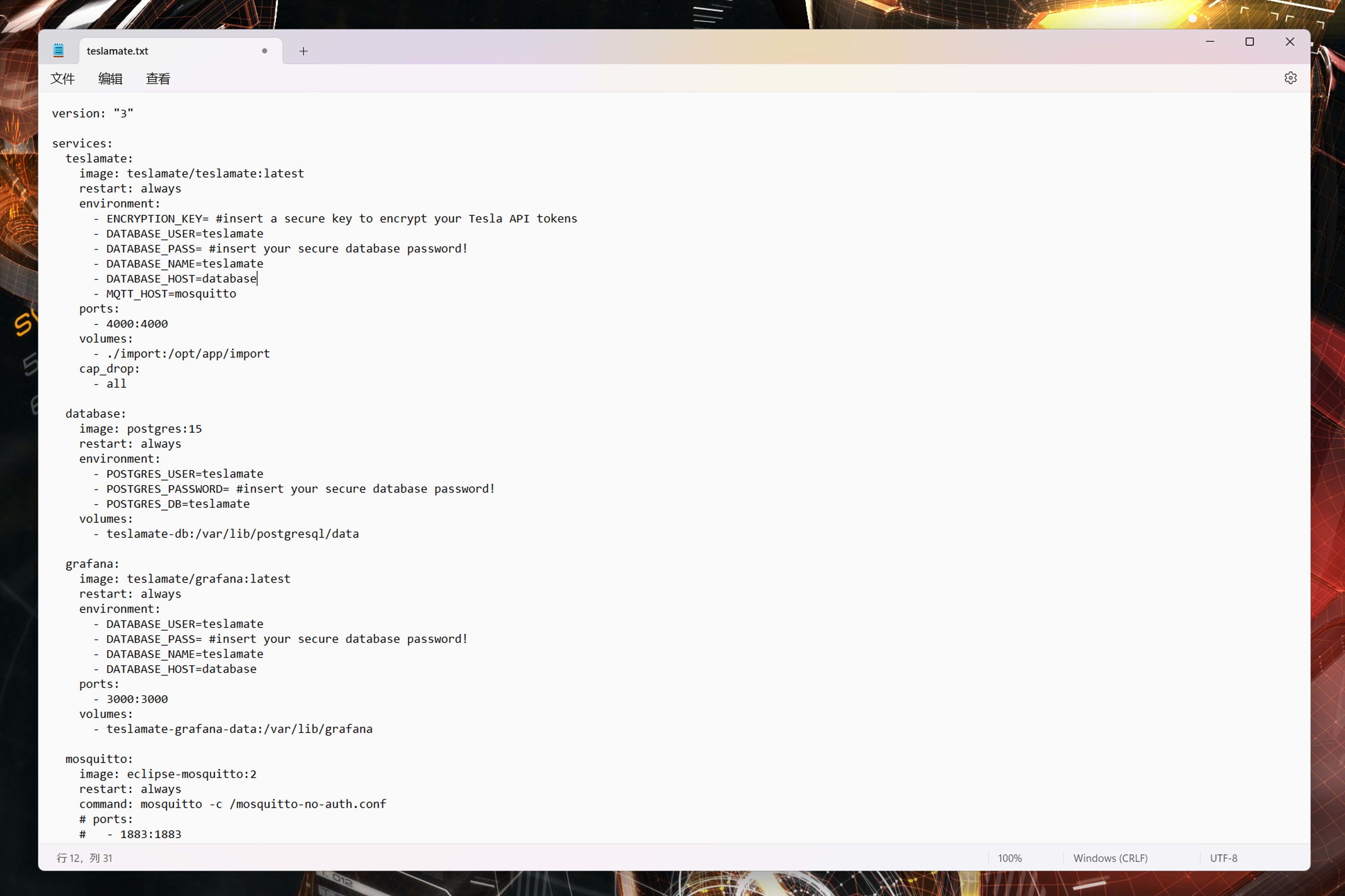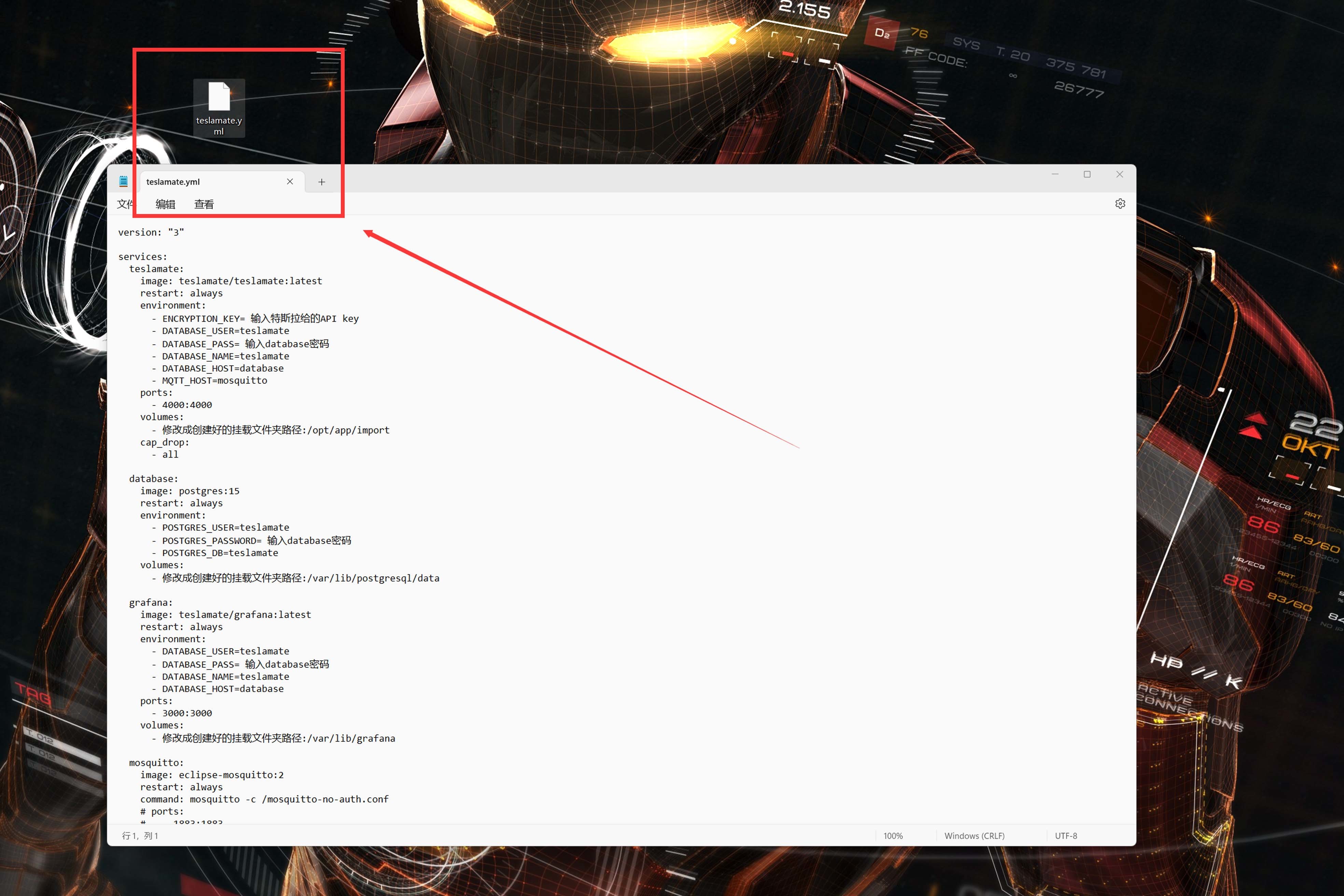 在多了yaml支持之后,TeslaMate的部署就非常简单了,第一步先创建用于执行的yml文件,在电脑桌面创建一个新的txt文档,直接将特斯拉给的代码模板复制进去。