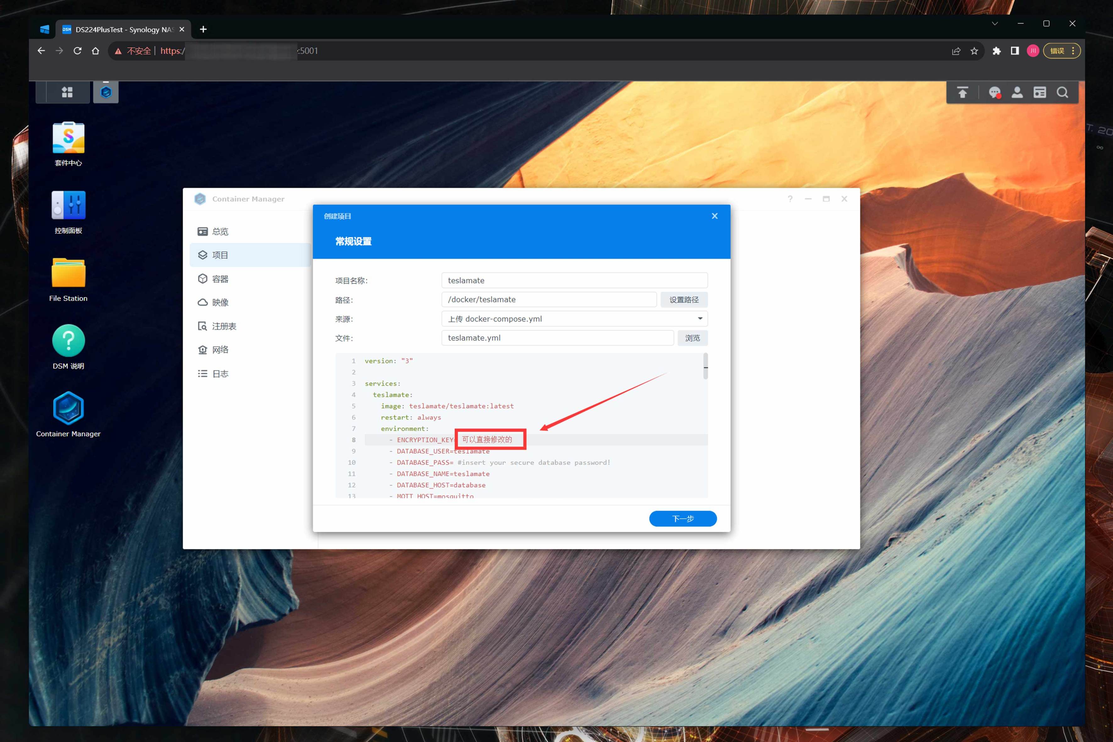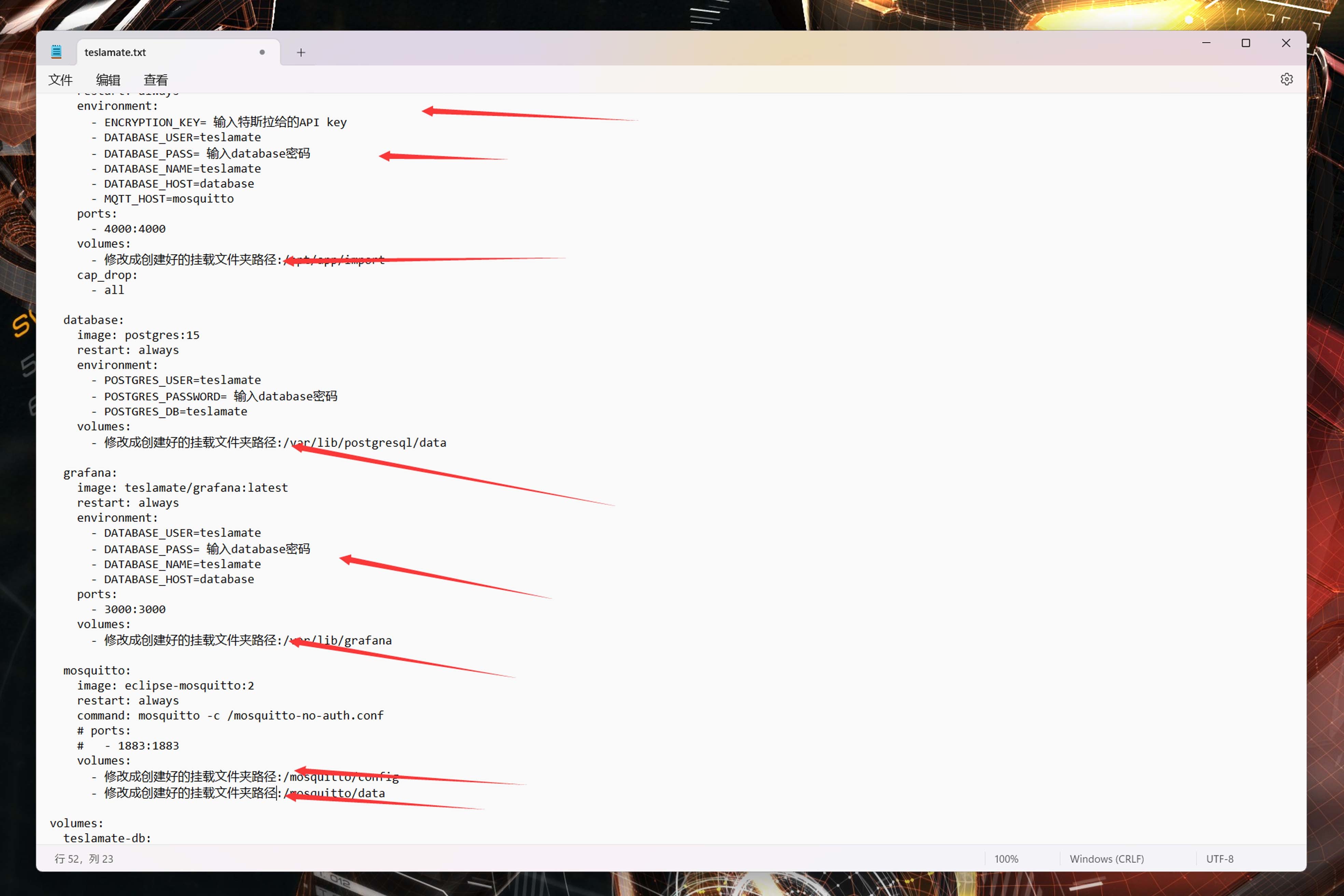 复制完代码之后,按照特斯拉官方说明填写API Key、创建Database密码以及修改这四个容器分别需要挂载出去的文件夹路径,需要修改的地方已经给大家标注出来了。