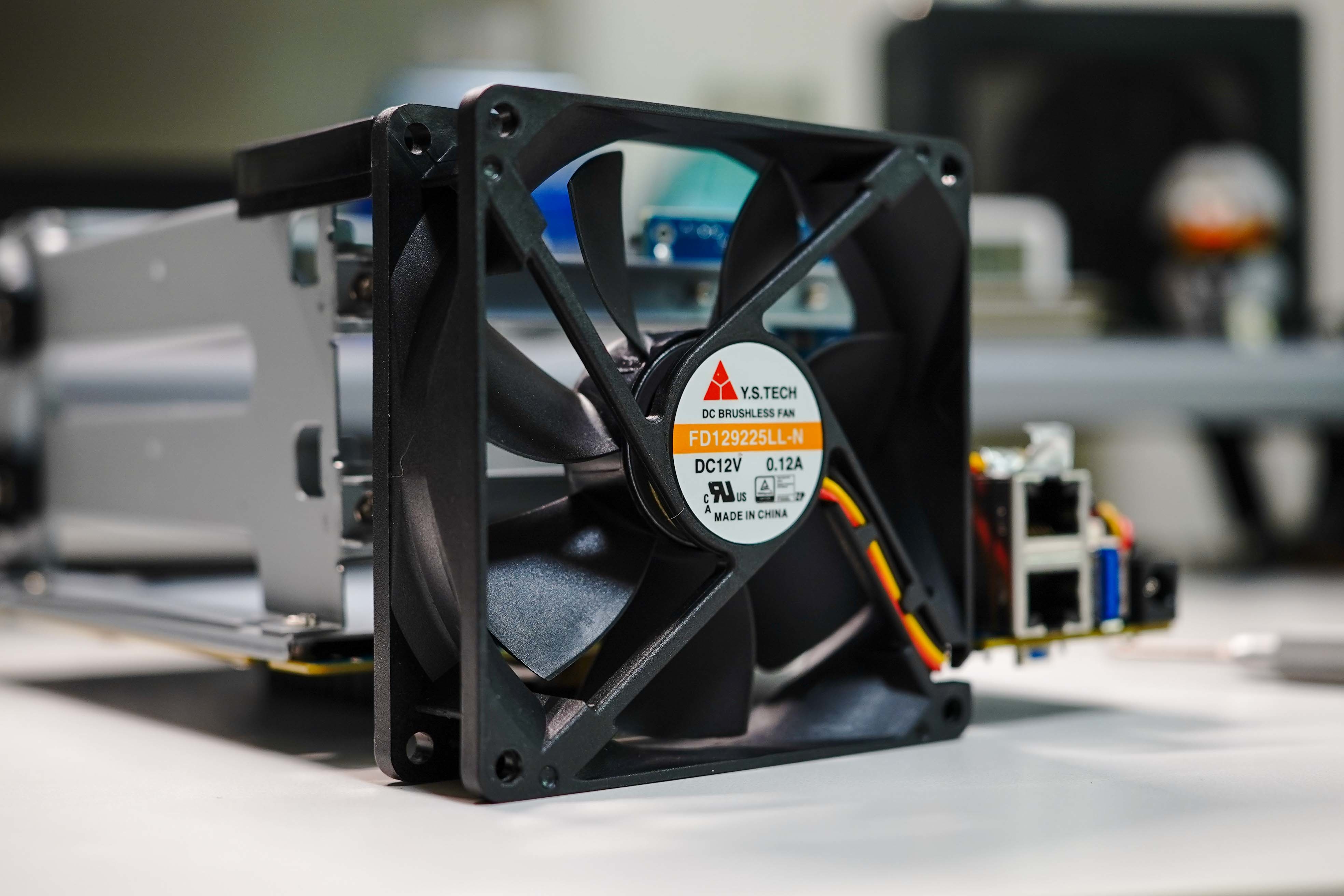 群晖DS224+的风扇方案依旧是台企特别喜欢使用的元山科技方案,型号为FD129225LL-N,最大转速可以到1900RPM,理论最大风噪则是23dBm,运行起来确实比较安静。