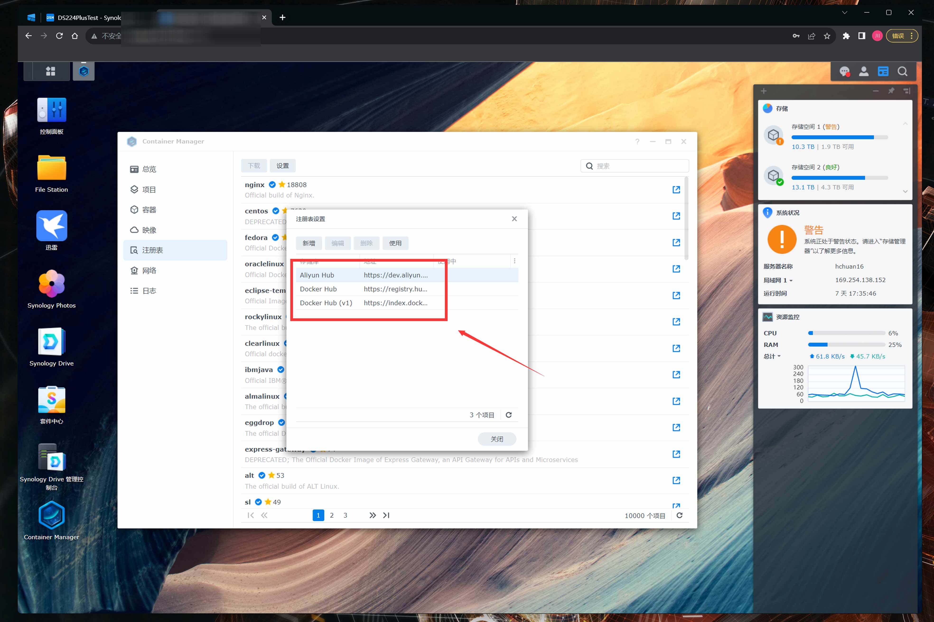 下面直接开始用实战讲解,先表扬一下群晖的RD,老用户应该知道DockerHub经常抽风,ContainerManager内置了三个仓库地址,设置入口如下:
