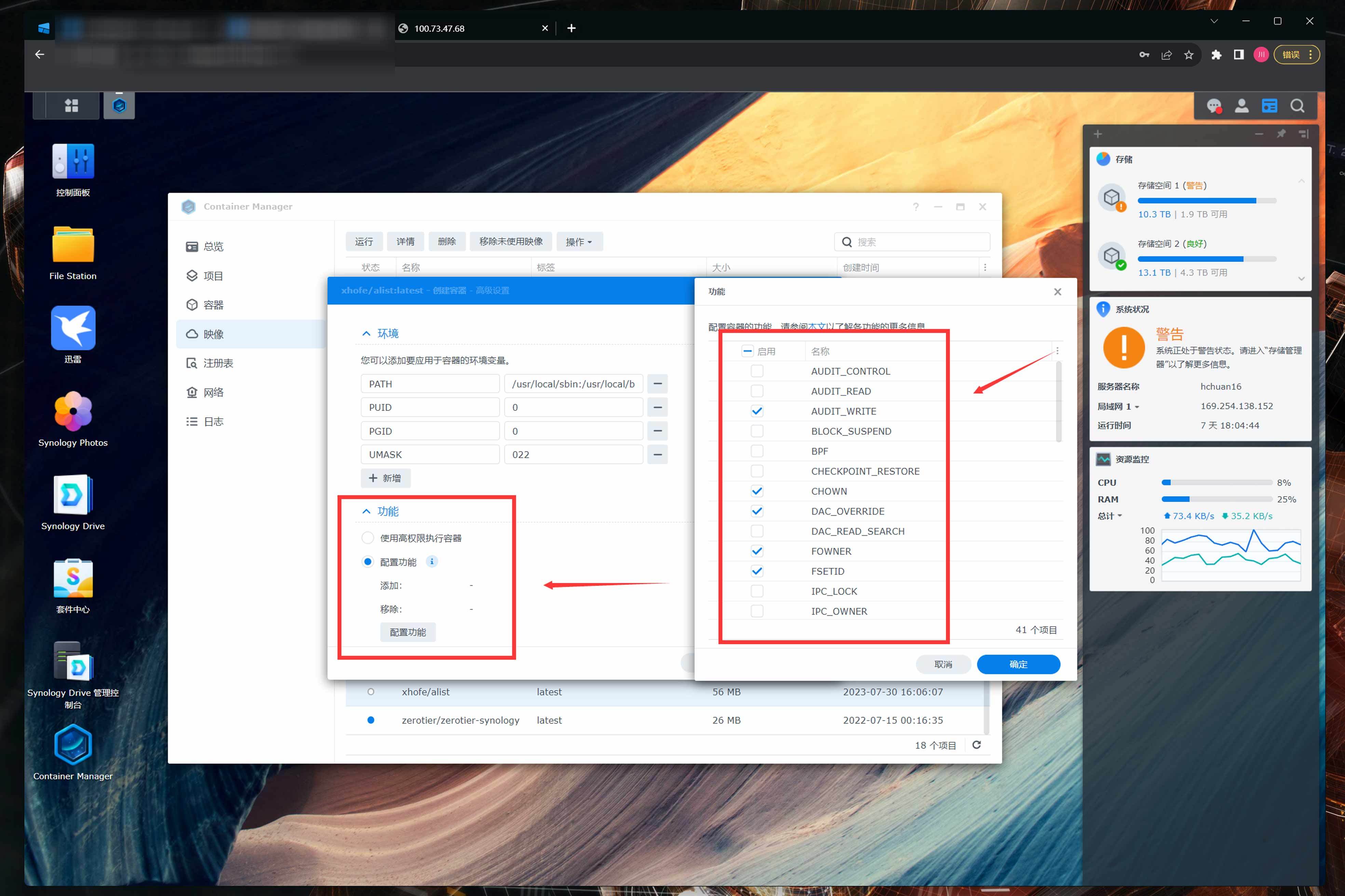 ● 第一种是使用高权限执行容器,也就是赋予全部权限,对Zerotier这类对NET_Admin有需求的项目来说是刚需,这个容器我就修改成了全权限。