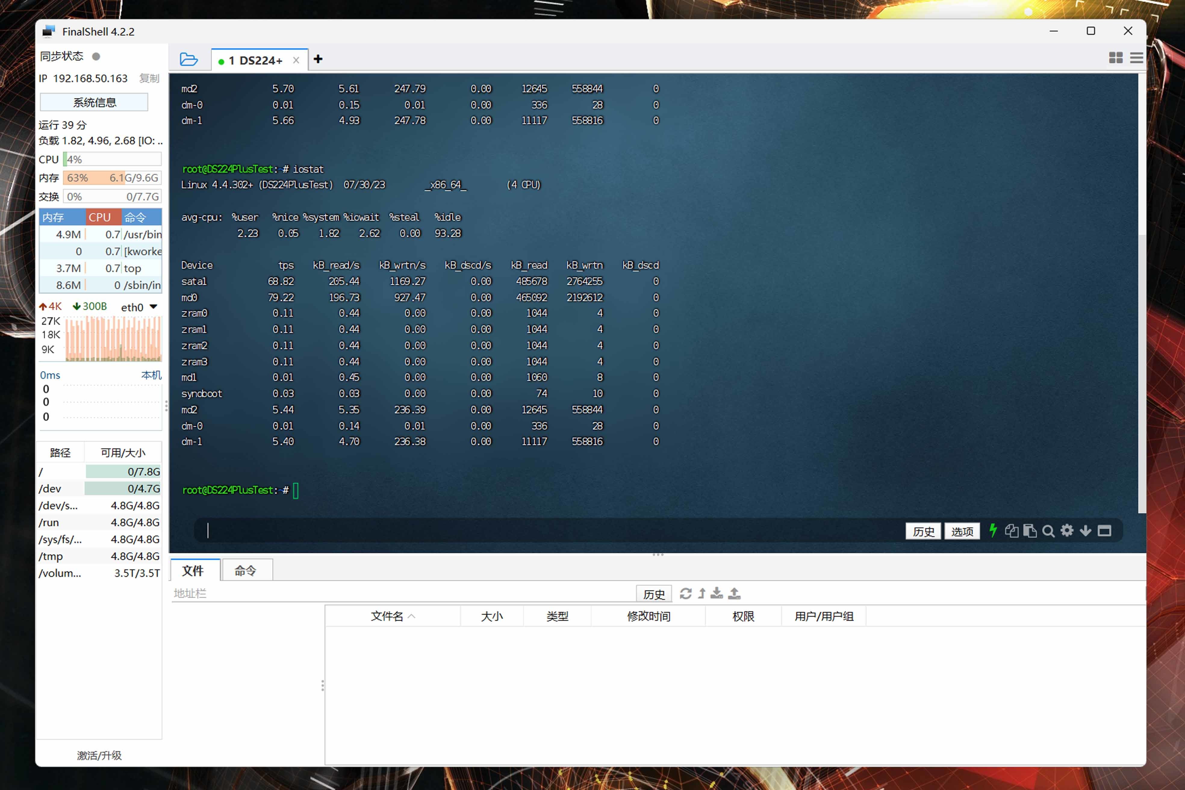 顺道测试一下群晖HAT3300这块硬盘的读写性能,通过iotat命令进行系统信息抓取,可以看到在空载状态下,整机io await值均在2-3ms以内,响应速度还是比较快的。