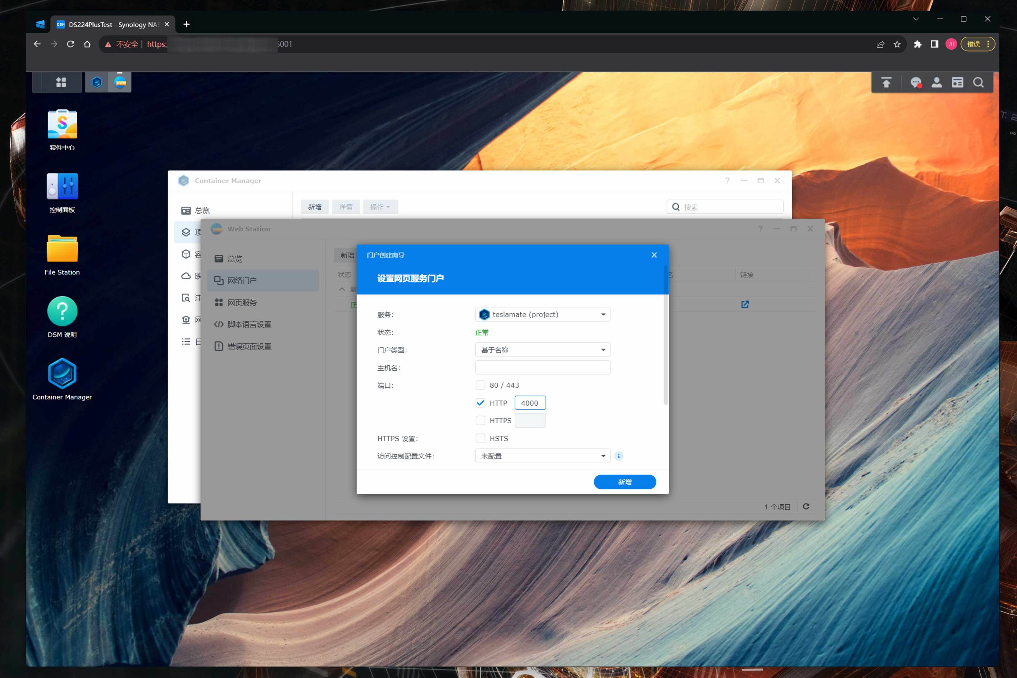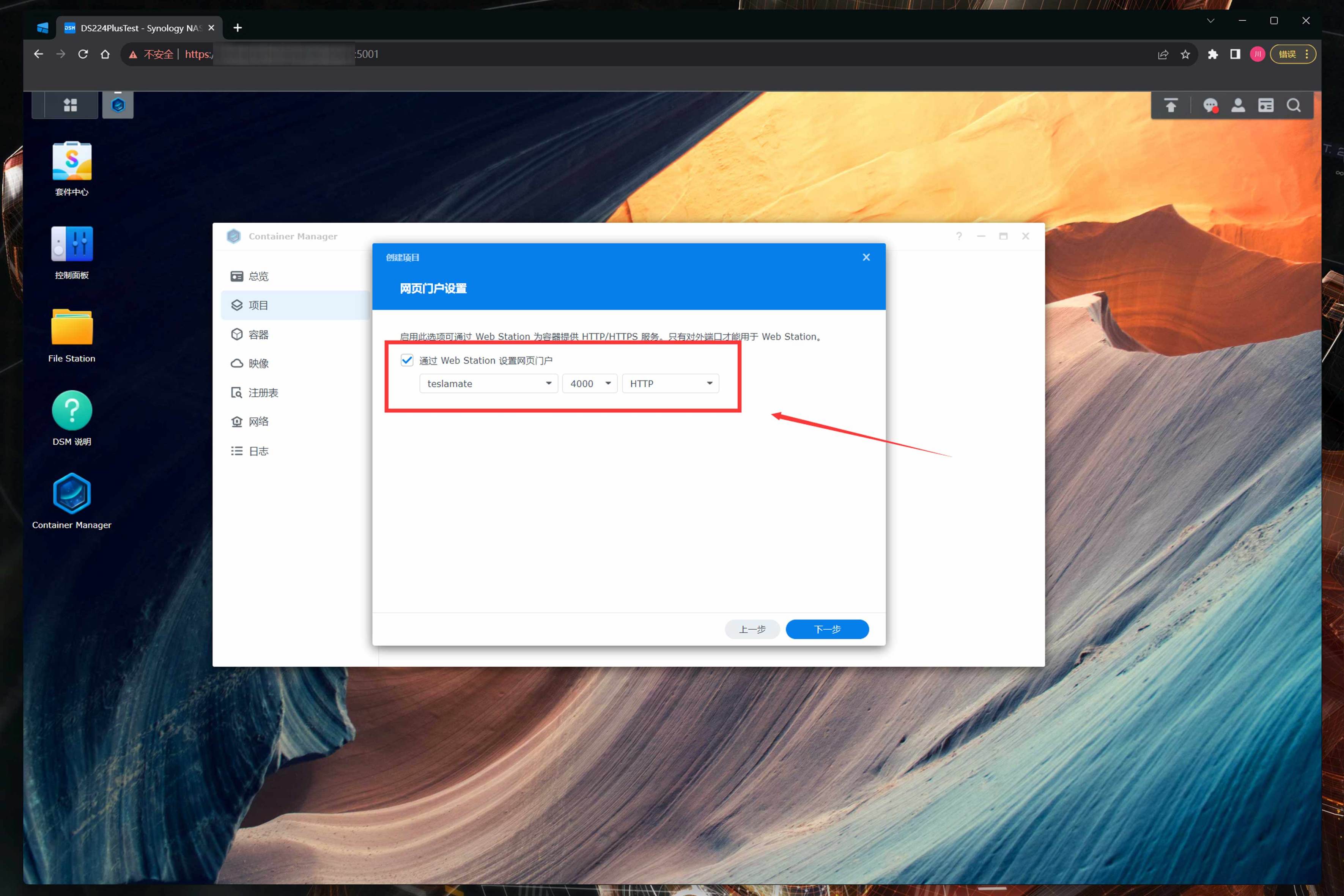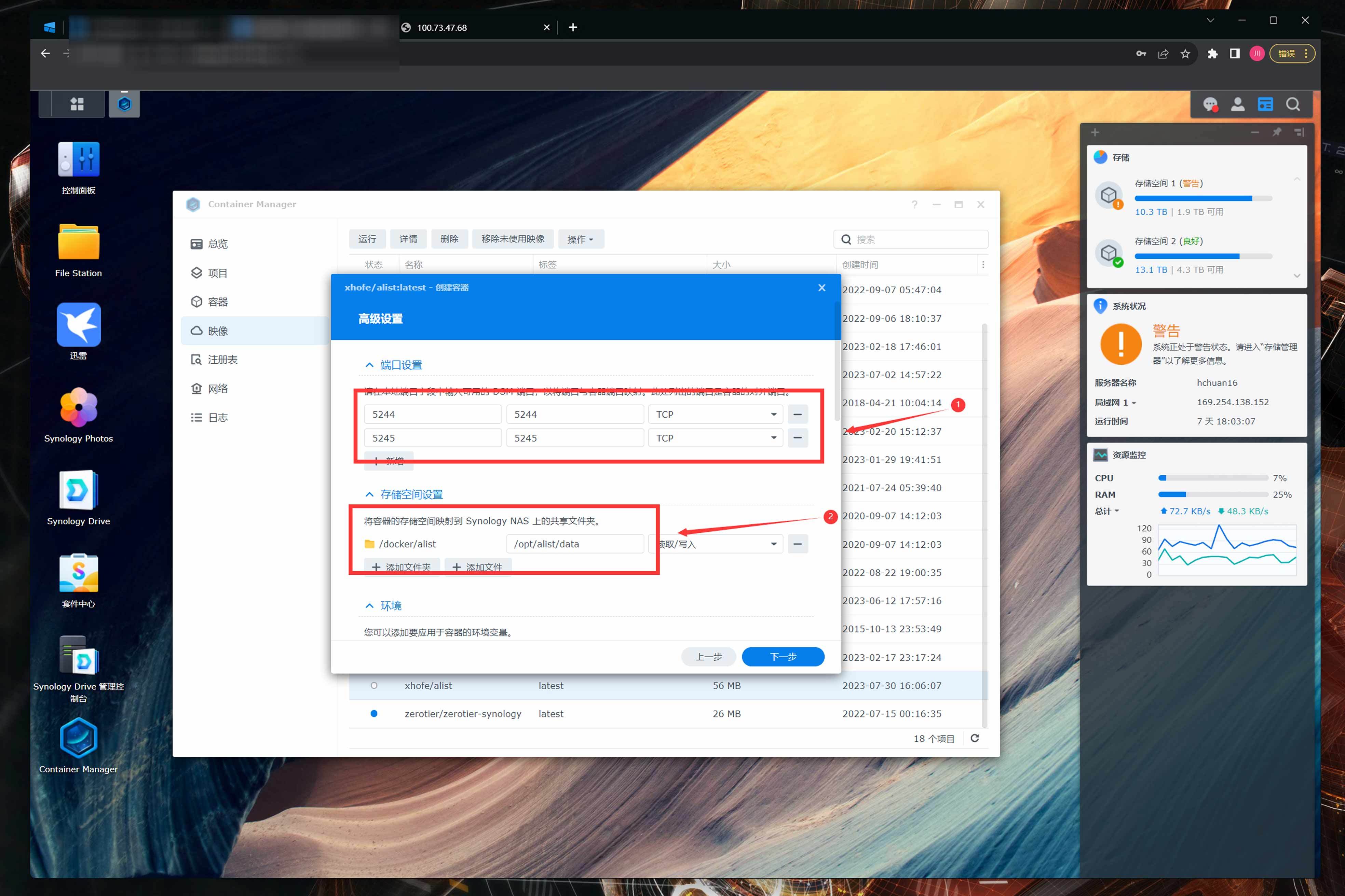 第二步开始配置容器参数,相比老版本Docker管理,ContainerManager将所有配置项目都做到同一页面中,逻辑类似Portainer,相比而言更方便,这里修改两条规则: