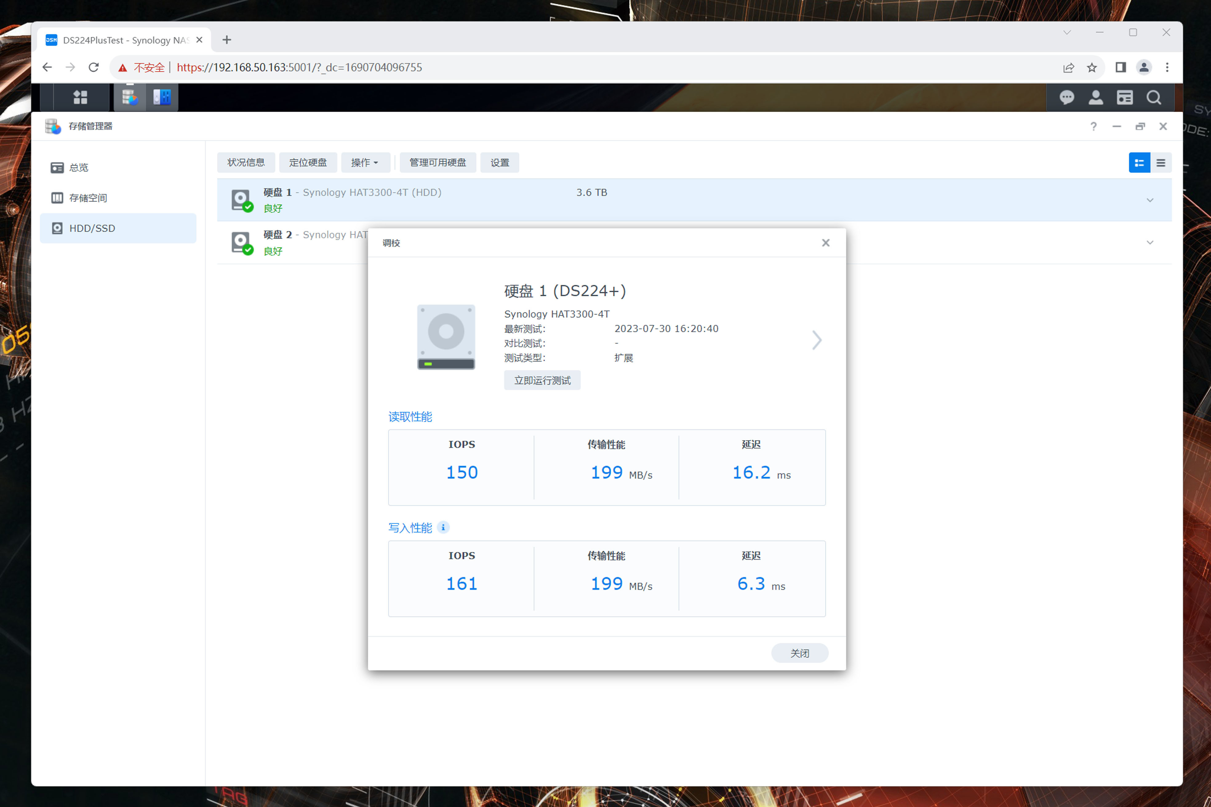 PS:这里遇到个坑,群晖自带的硬盘测速工具,必须是空盘且有两块硬盘的状态下才能执行操作,然而这两个条件DSM并没有说明,切记切记。