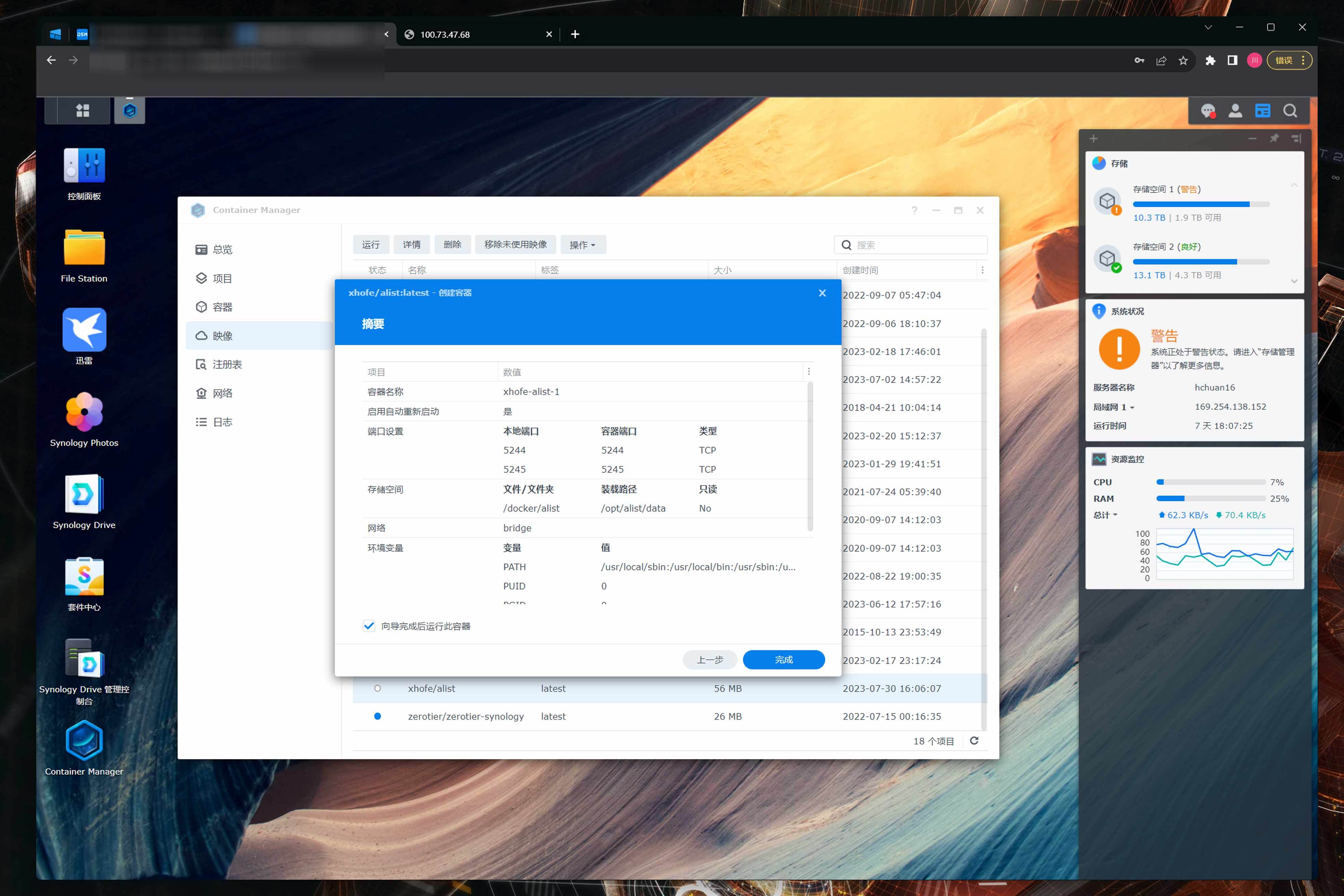 PS:考虑到系统升级重启以及异常断电的可能,建议部署容器时勾选上启用自动重新启动这个选项。