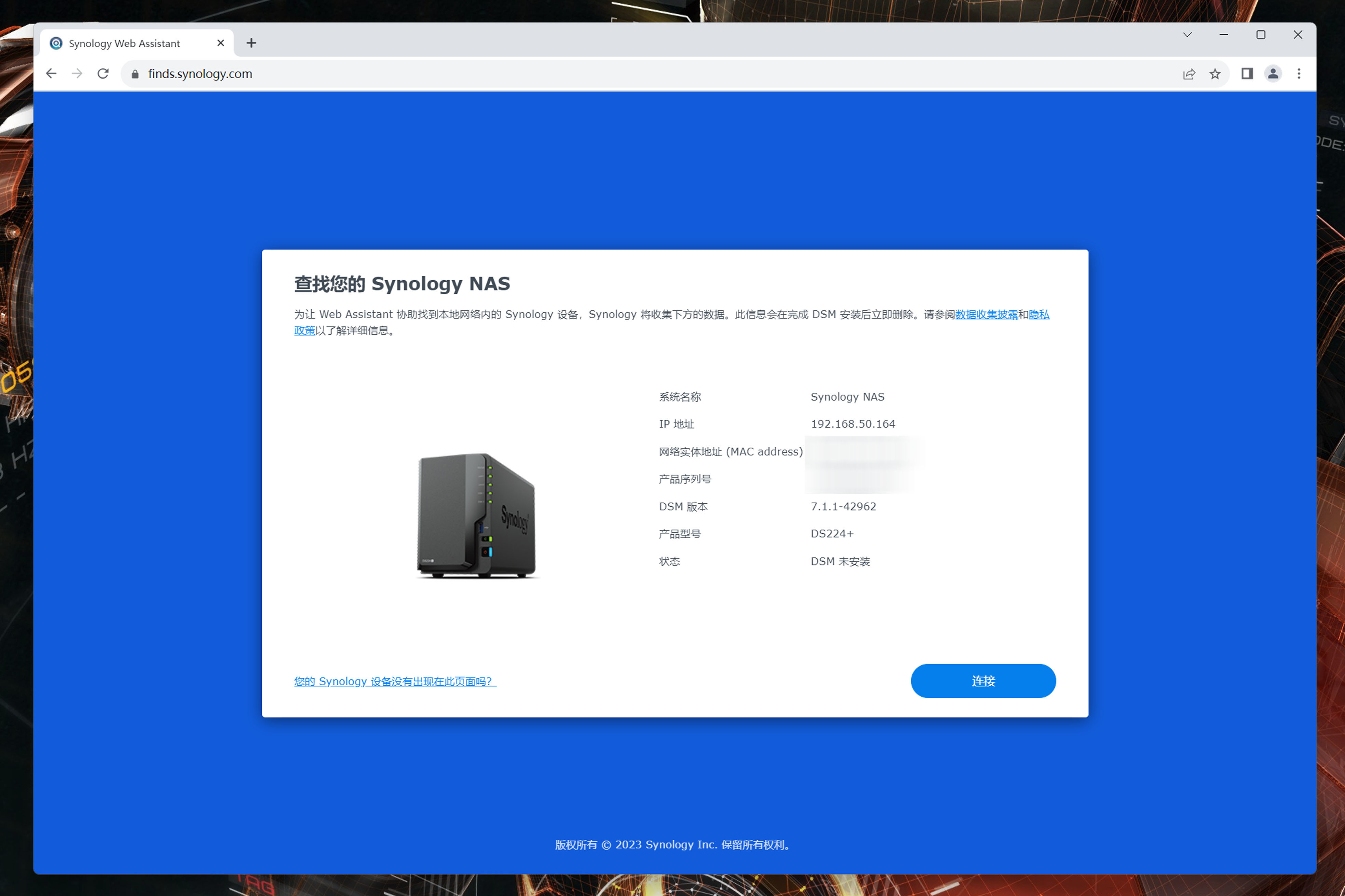 作为目前最出色的NAS系统之一,群晖DSM的初始化非常简单,一路下一步即可,这里就不再水字数,不知道怎么进网页后台的朋友请直接在浏览器输入下面地址找寻设备: