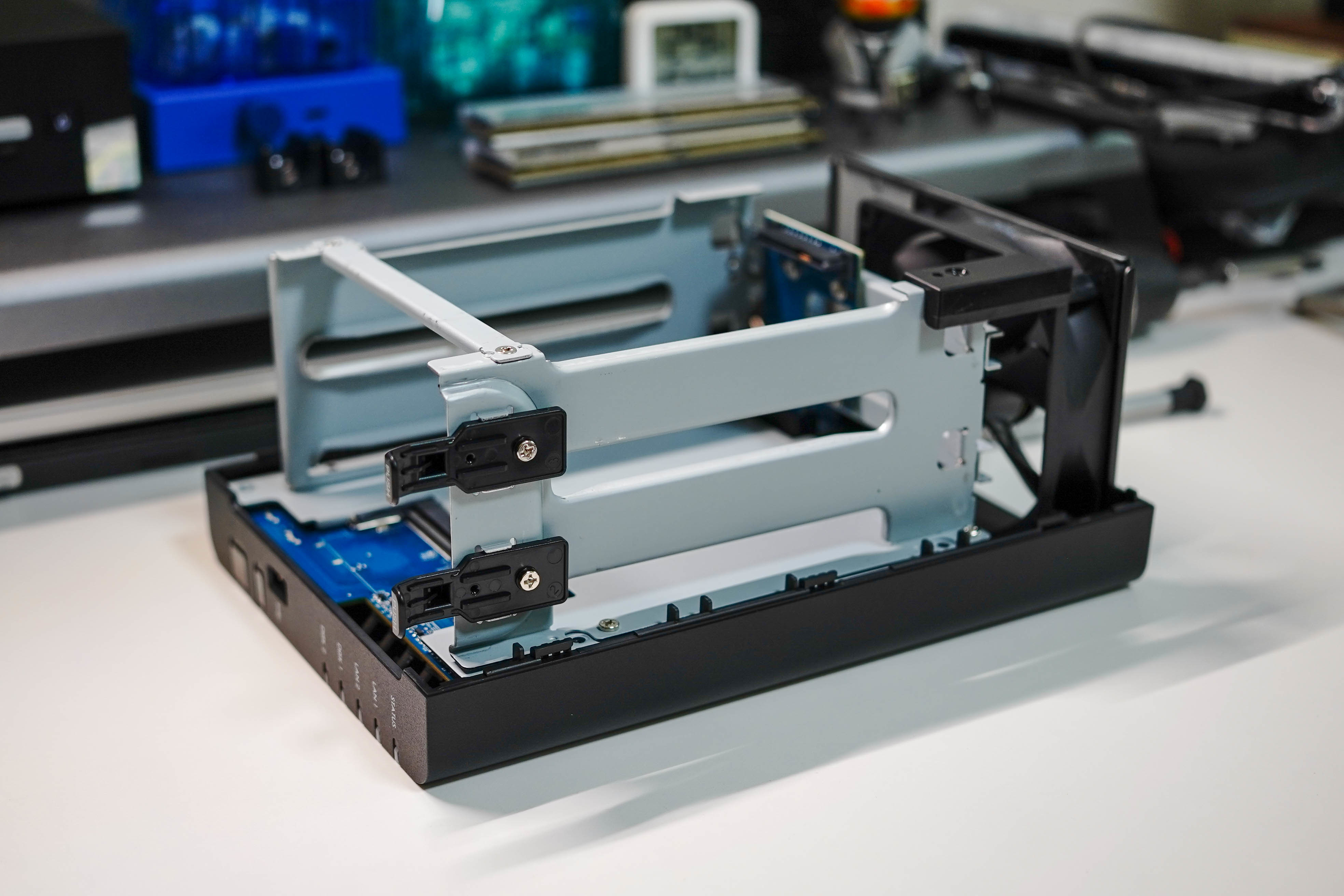 内部结构如下图所示,硬盘框架用螺丝固定在主板上,风扇则是通过卡扣固定在硬盘框架和外壳之间,这里的螺丝同样没有易碎标,手比较稳的好奇宝宝可以放心拆,不会影响保修的。