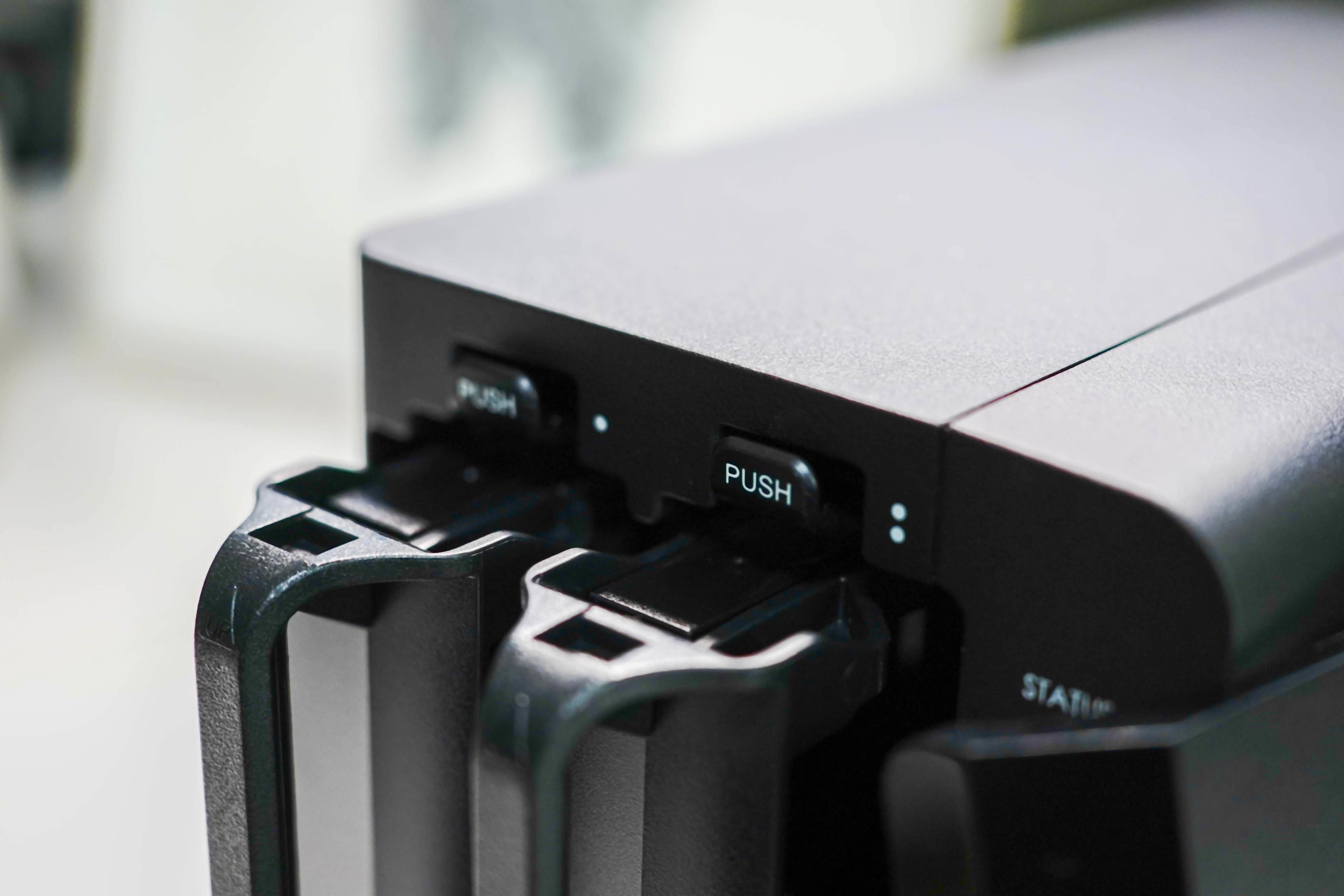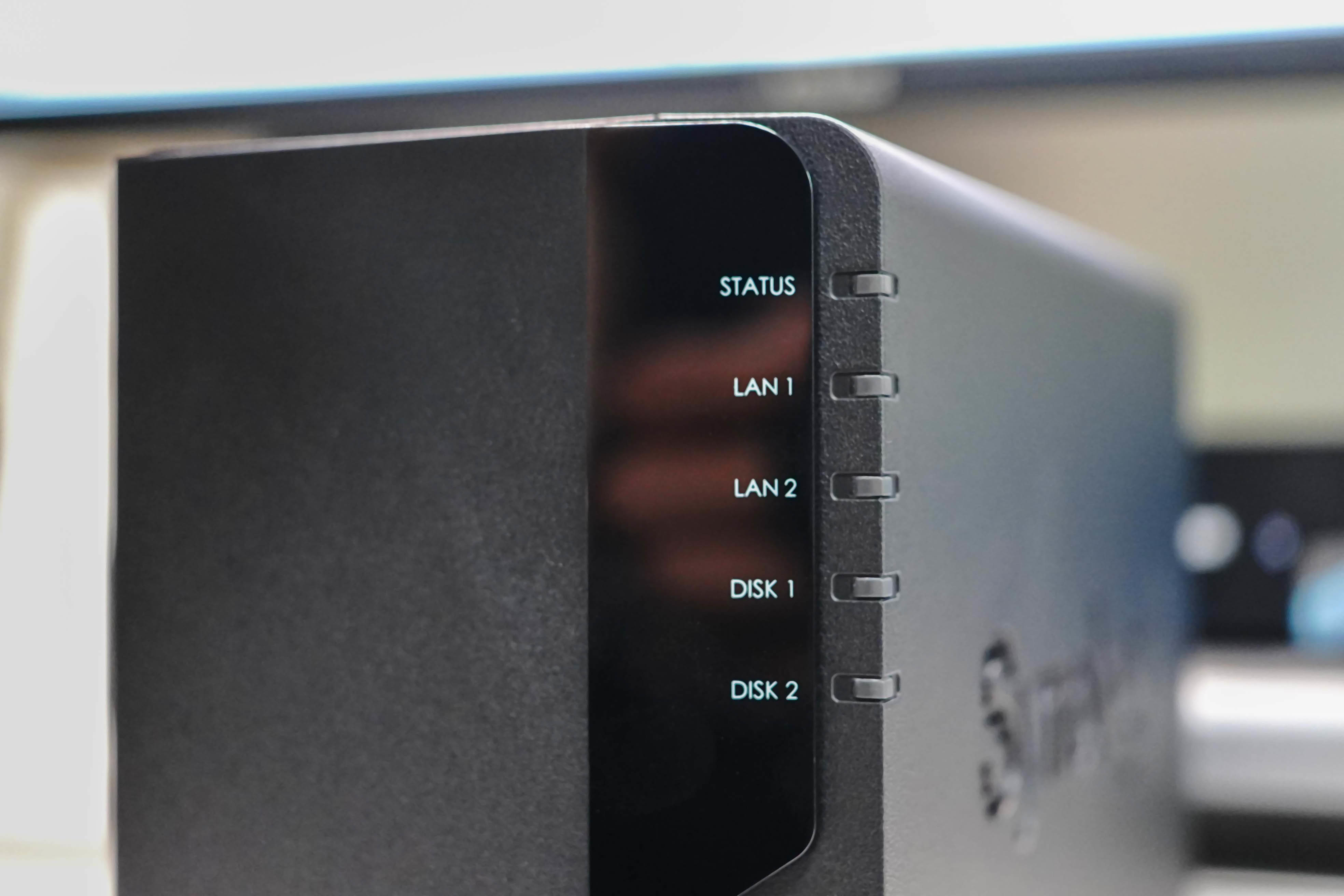 设备两侧都有的Synology标志除了表明设备身份,同时也做了镂空设计,作为进气栅虽然进气量有限,但也是的风道组成部分之一。