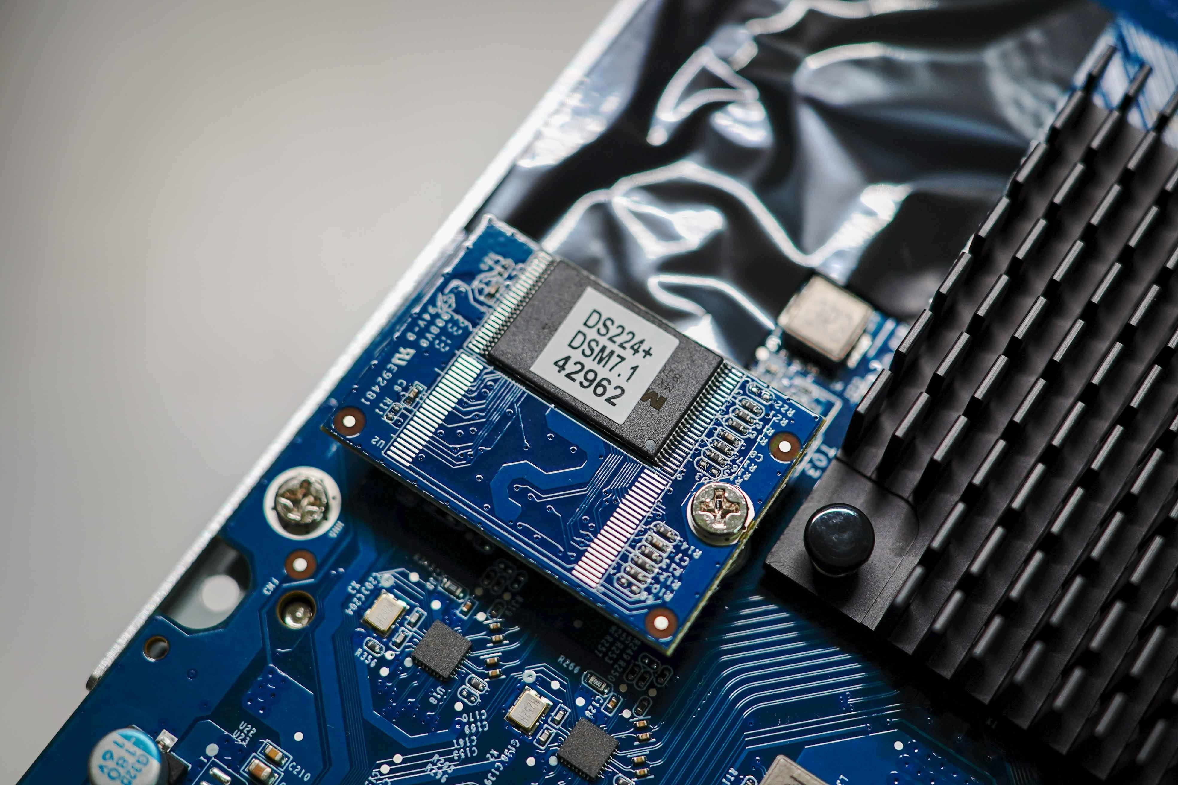 拆机时发现主板上的这个模块真不认识,问了下群晖的工作人员,这是存放引导的eMMC,投一次见到这种形态的硬盘,确实比较新颖。