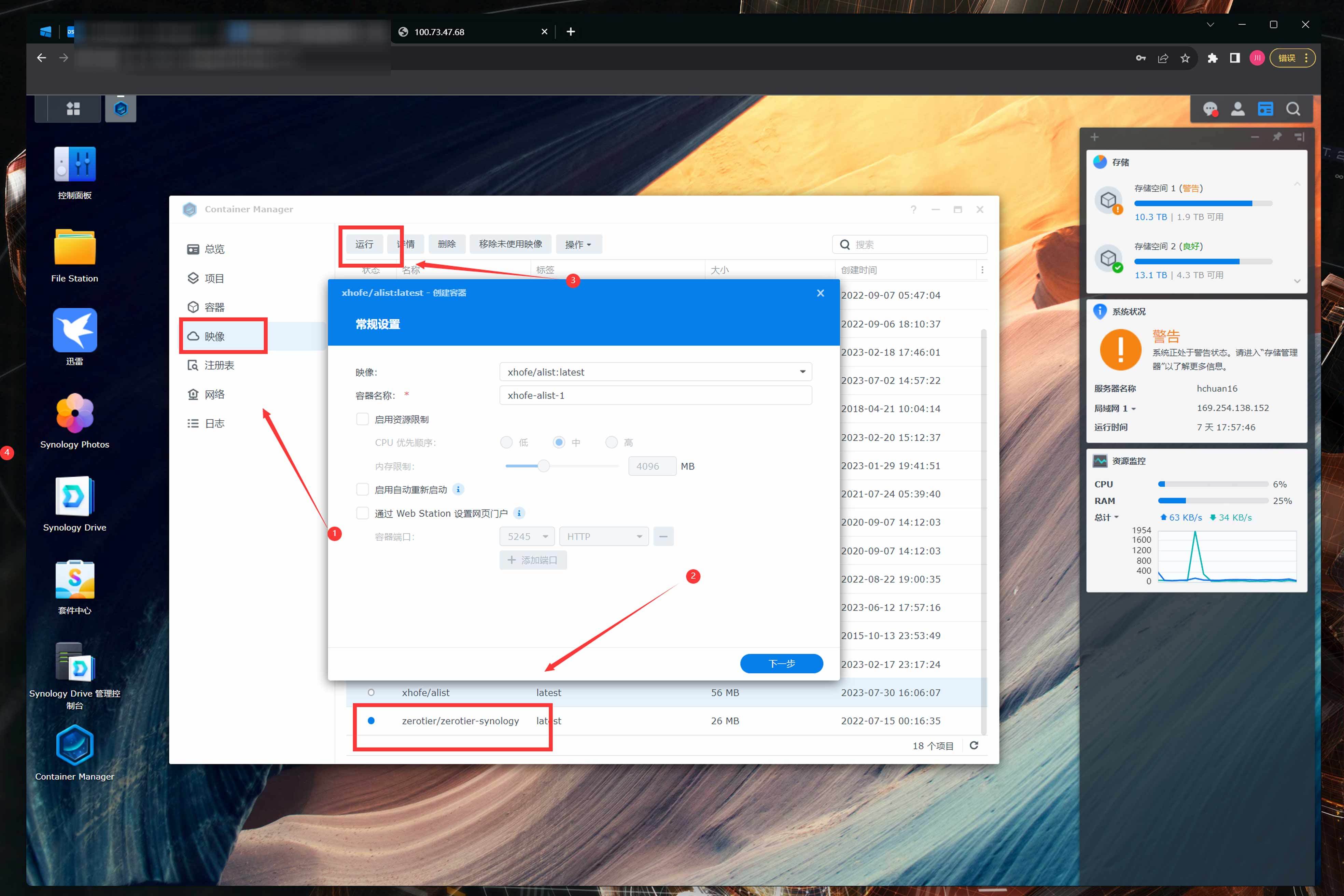 镜像下载完成后正常会跳转到映像页面,选中alist的镜像后点击运行,接下来开始正式进入部署环节。