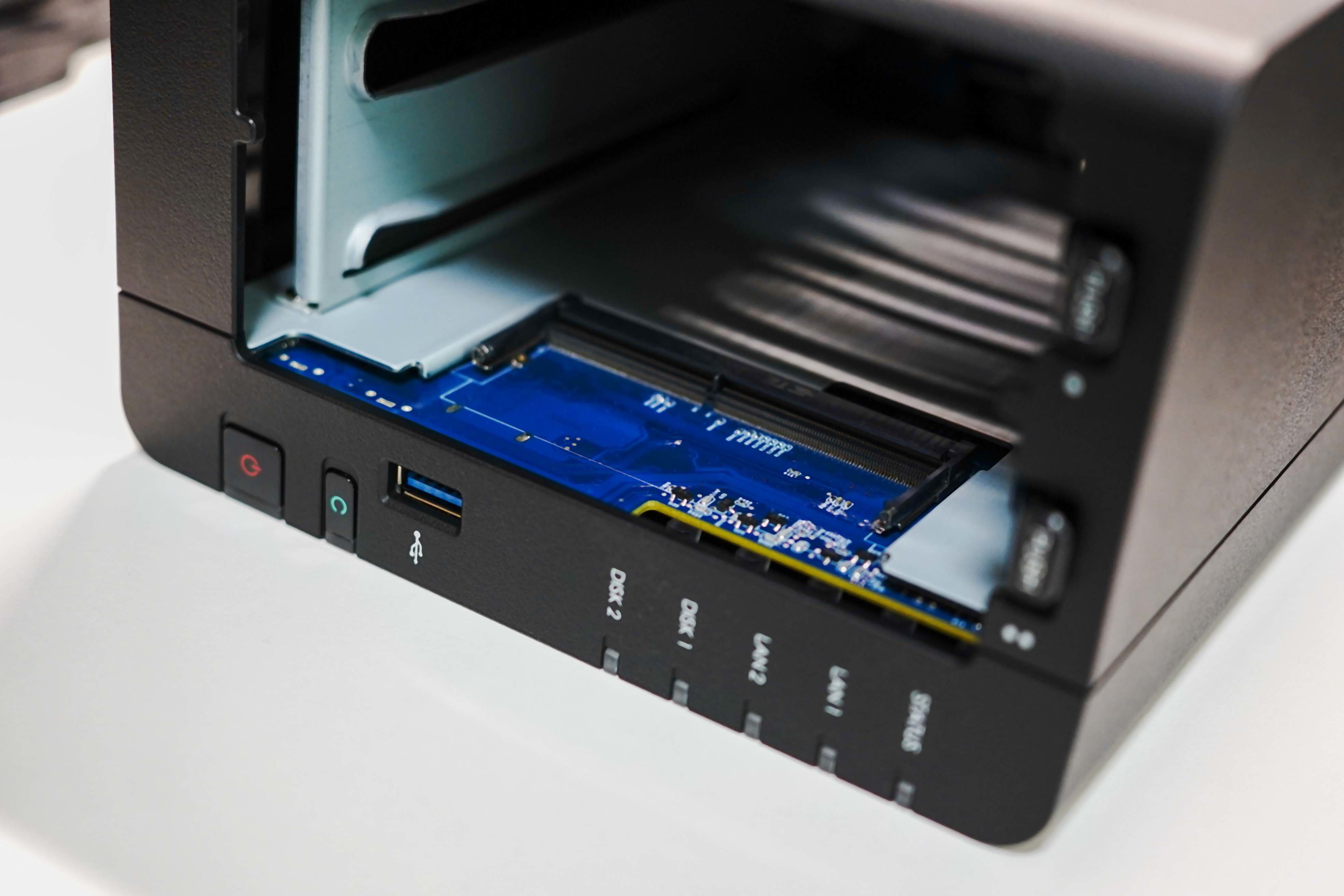 如果只是加装内存,其实并不需要拆卸设备外壳,取出硬盘笼就能看到留空的SO-DIMM槽位,协议为DDR4,实测加装8G单条一样可以正常识别使用。