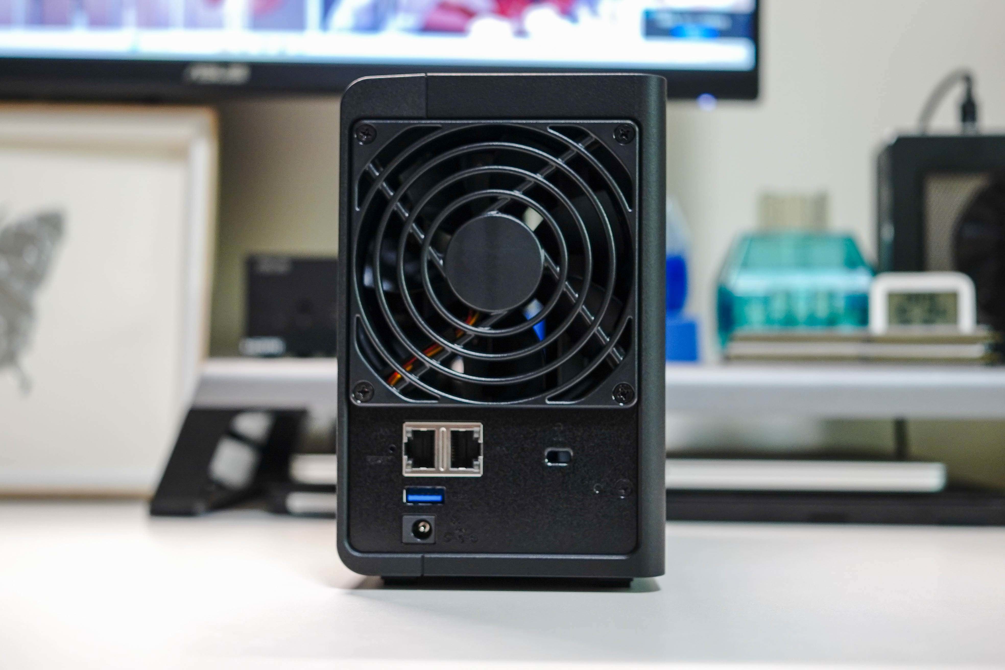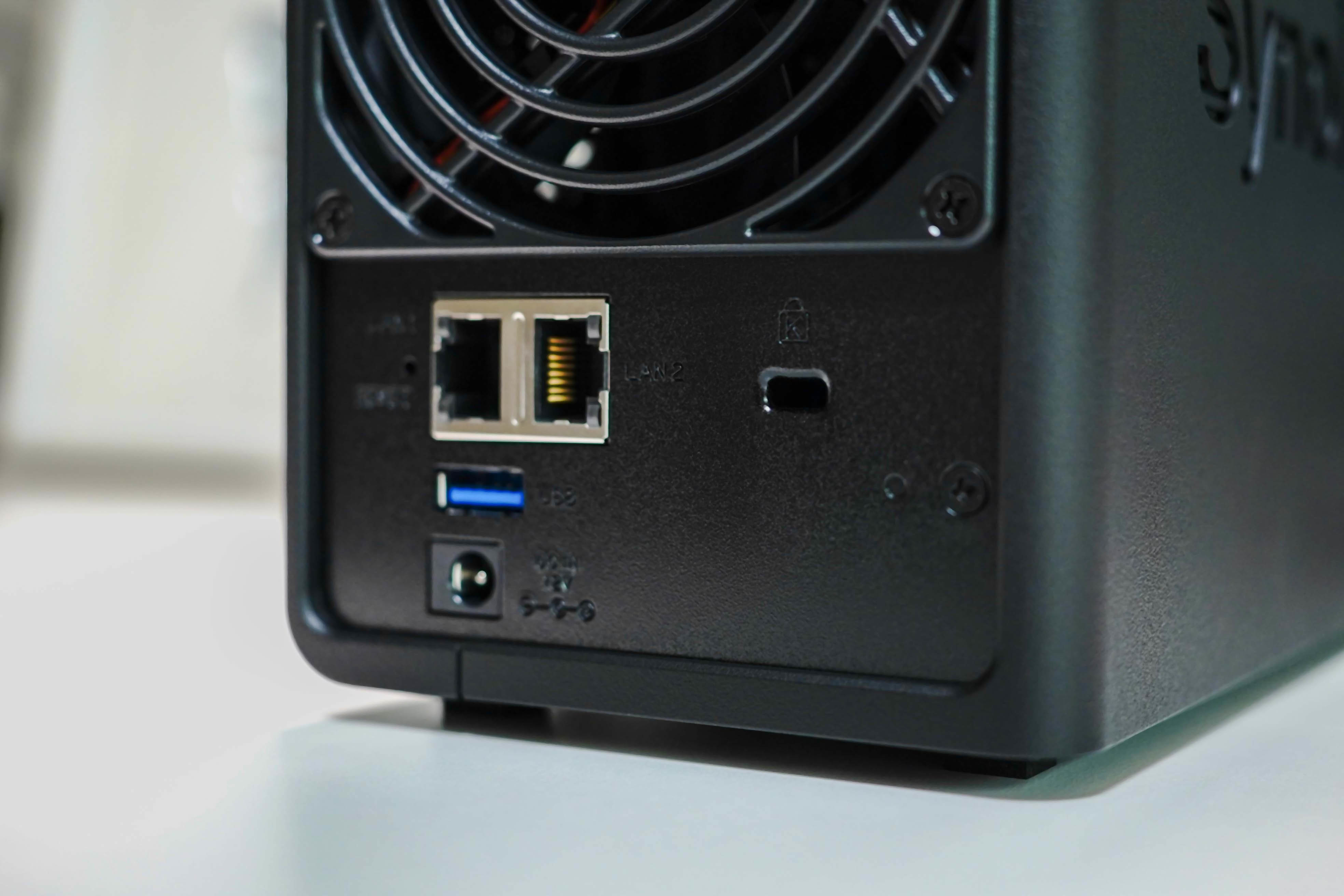 群晖DS224+的背部设计同样简单,包含一颗9cm的散热风扇,下半部分则是接口区域,由于采用的是J4125这个低功耗平台,所以供电方案依旧是不占地方的DC接口。